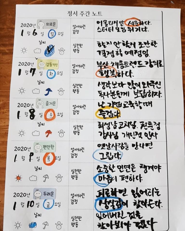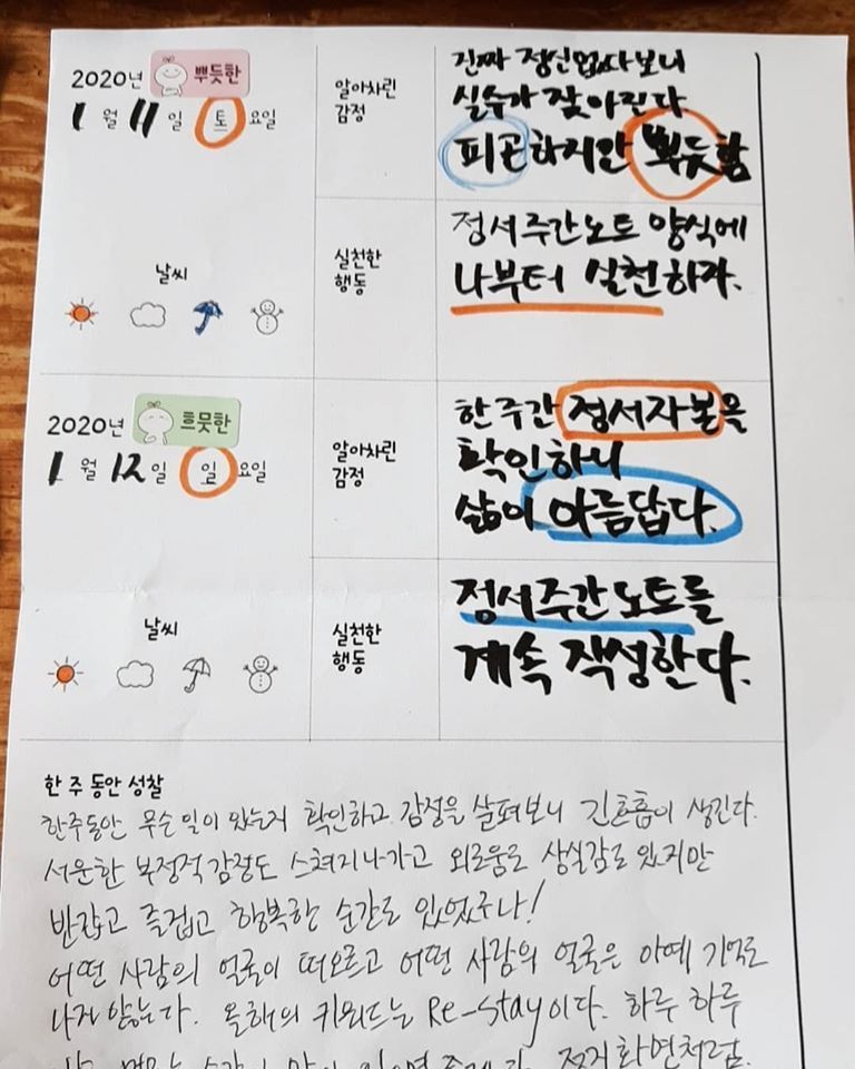 한 주 동안 무슨 일이 있는지 확인하고 감정을 살펴보니 긴 호흡이 생긴다.서운한 부정적 감정도 스쳐지나가고 외로움도 상실감도 있지만 반갑고 즐겁고 행복한 순간도 있었구나!