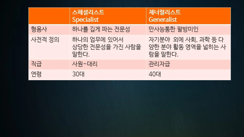 직급별로 사원이나 대리에서는 스페셜리스트를 추구하는 것이 좋다면 관리자급이나 임원에서는 제너럴리스트를 추구하는 것이 좋을 수 있다. 30대에는 스페셜리스트로 성장해서 40대는 제너럴리스트로 확장해야 한다. 프로페셔널리스트는 이미 스페셜리스트와 제너럴리스트가 융합한 인재이다.