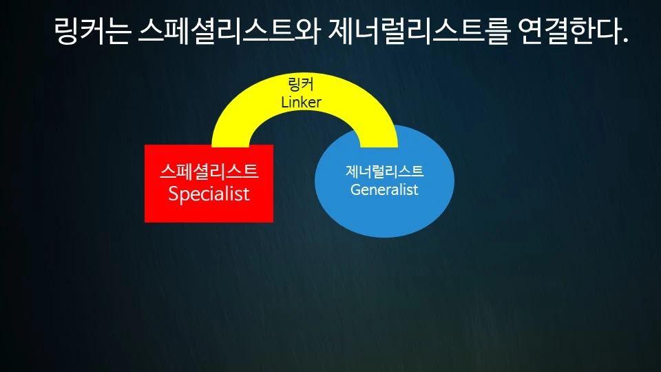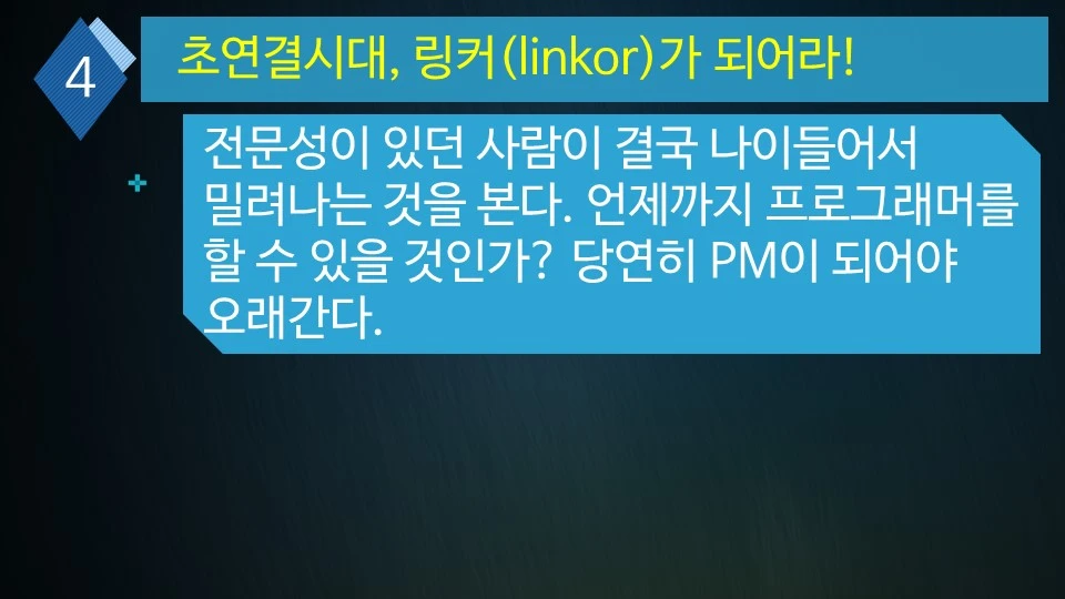원래 링커란 축구용어로 공격수와 수비수를 연결하는 하프백을 의미한다. 지금은 DNA 데이터, 네트워크, 인공지능 등 전세계가 이미 하나의 시장으로 연결된 초연결 시대에서 어떻게 살아남을 것인가를 고민해야 한다. 단순히 컴퓨터 전공을 했으니 프로그래머 직무를 고집해서는 애자일 조직 문화에서 살아남기 힘들다. 프로그래머의 경험과 리더십을 발휘해서 PM으로 성장해야 하는 것이다.