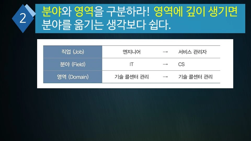 영역에 깊이 생기면 분야를 옮기는 것이 생각보다 쉽다. 예를 들면 엔지니어로 컴퓨터공학과를 졸업해서 IT 분야에 기술콜센터 관리자로 7년정도 근무한 사람이 있었다. 이 사람은 자신이 엔지니어라고 생각하고 IT분야에 지원했지만 번번히 재취업에 실패했다. 다시 CS분야로 바꾸고 결국 취업에 성공했다. 자신의 포지션을 명확하게 하지 않으면 경쟁력을 잃게 된다.