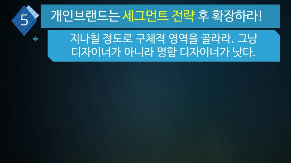 5. 개인브랜드는 세그먼트 전략 후 확장하라. 어떤 영역이든 처음에는 지나칠 정도로 좁게 구체적 영역을 선택해야 한다. 자신이 가장 잘 할 세부적 영역을 선택하고 세그먼트 전략을 구사해야 한다. 그냥 디자이너가 아니라 명함 디자이너가 낫다. 예를 들어서 프로그래머가 아니라 게임분야 C++프로그래머가 되어야 한다. 최소 3~5년은 무조건 관련책도 읽고 관련 분야의 사람을 만나서 교류를 해야 한다. 그러면 두가지 전략이 나오게 된다. 제너럴 스페셜리스트로 성장할 것인가? 스페셜 제너럴리스트로 성장할 것인가?