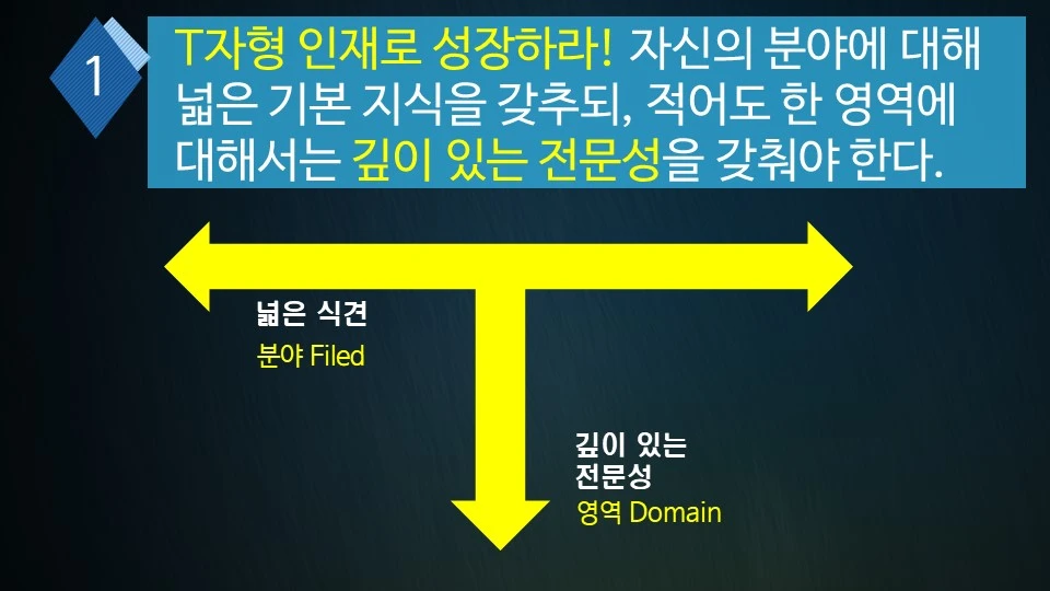 자신의 분야에 대해 넓은 기본 지식을 갖추되, 적어도 한 영역에 대해서는 깊이 있는 전문성을 갖춰야 한다. 옛날에 이야기 많이 되었던 T자형 인재와도 관련이 있다. 일본의 도요타에서 시작한 'T자형 인재'는 특정분야의 전문적 소질(세로축)을 갖춤으로써 다양한 소양(가로축)을 넓게 지닌 사람을 의미한다.