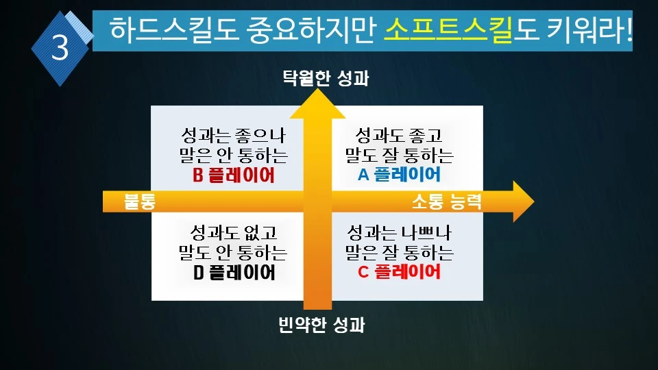 탁월한 성과를 올리는 A플레이어들은 단순히 하드스킬에서만 머물지 않고 스프트스킬도 실력을 키워서 리더십, 협상력, 등에서 인정을 받는다.