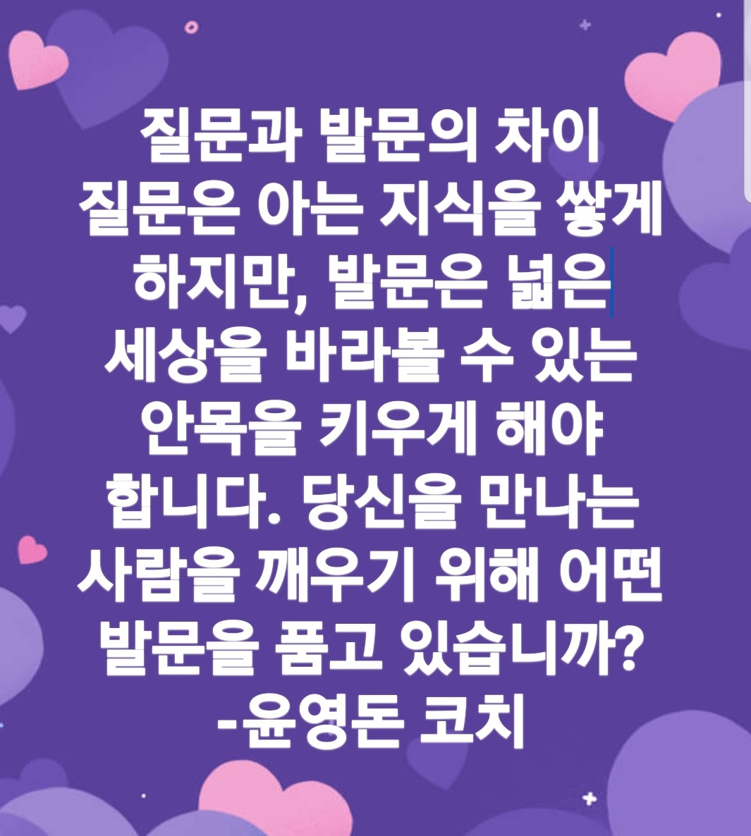 질문은 내가 알기 위한 욕구라면, 발문은 상대방을 깨우기 위한 욕망입니다. 질문은 모르는 것을 상대방에게 물어보는 것이라면, 발문은 학습을 촉진하기 위해 학습자에게 물어보는 문제제기를 의미합니다. 질문은 내가 나를 채우기 위해서 시작하지만, 발문는 다른 사람을 위한 마음에서 시작합니다. 질문은 일상적 상황에서 모르기 때문에 알고 싶어서 일어난다면, 발문은 교수학습 상황에서 학습자 스스로 깨달음을 얻게 위해 교수자가 묻기 때문에 발생합니다. 질문은 아는 지식을 쌓게 하지만, 발문은 넓은 세상을 바라볼 수 있는 안목을 키우게 해야 합니다. 당신을 만나는 사람을 깨우기 위해 어떤 발문을 품고 있습니까?