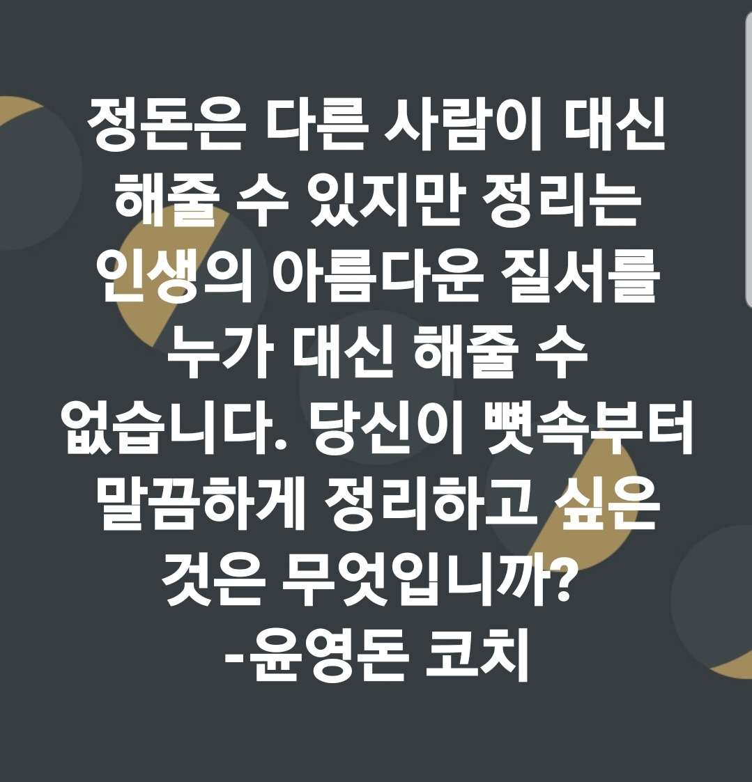 정돈과 정리의 차이 정돈은 흐트러진 것을 가지런히 고친 것이라면 정리는 혼란스러운 것을 없애는 것입니다. 정돈은 보이는 것을 가지런히 바꾸는 것이라면 정리는 불필요한 것을 제거해 질서를 회복하는 것입니다. 정돈은 다른 사람이 대신 해줄 수 있지만 정리는 인생의 아름다운 질서를 누가 대신 해줄 수 없습니다. 정돈은 어지럽힌 외부를 예쁘게 정렬하면 되지만 정리는 뼛속 내면부터 체계적으로 분류해야 합니다. 당신이 뼛속부터 말끔하게 정리하고 싶은 것은 무엇입니까? -윤영돈 코치