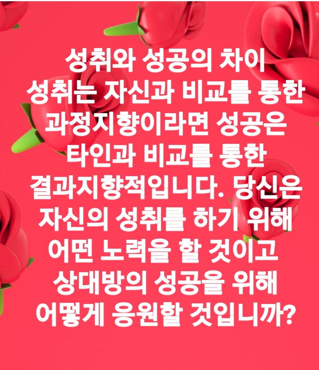 성취는 "난 누가 뭐래도 해내고 말 꺼야!" 자신이 이뤄낸 것이라면 성공은 "나는 실패하지 않을 거야!" 다른 사람들과 비교해서 이뤄낸 것입니다. 성취(achievement)의 동기는 조직의 목표보다 높은 수준에서 수행하거나 완성하고 싶어 하는 의욕을 말한다면 성공(success)의 동기는 목적한 바를 이루기 위해 수단을 가리지 않은 욕망입니다. 성취(成就)는 학습이나 습득을 통해 얻는 과정이라면 성공(成功)은 성적이나 사회적 지위를 얻게 되는 결과입니다. 성취는 자신과 비교를 통한 과정 지향이라면 성공은 타인과 비교를 통한 결과 지향적입니다. 당신은 자신의 성취를 하기 위해 어떤 노력을 할 것이고 상대방의 성공을 위해 어떻게 응원할 것입니까?