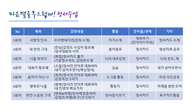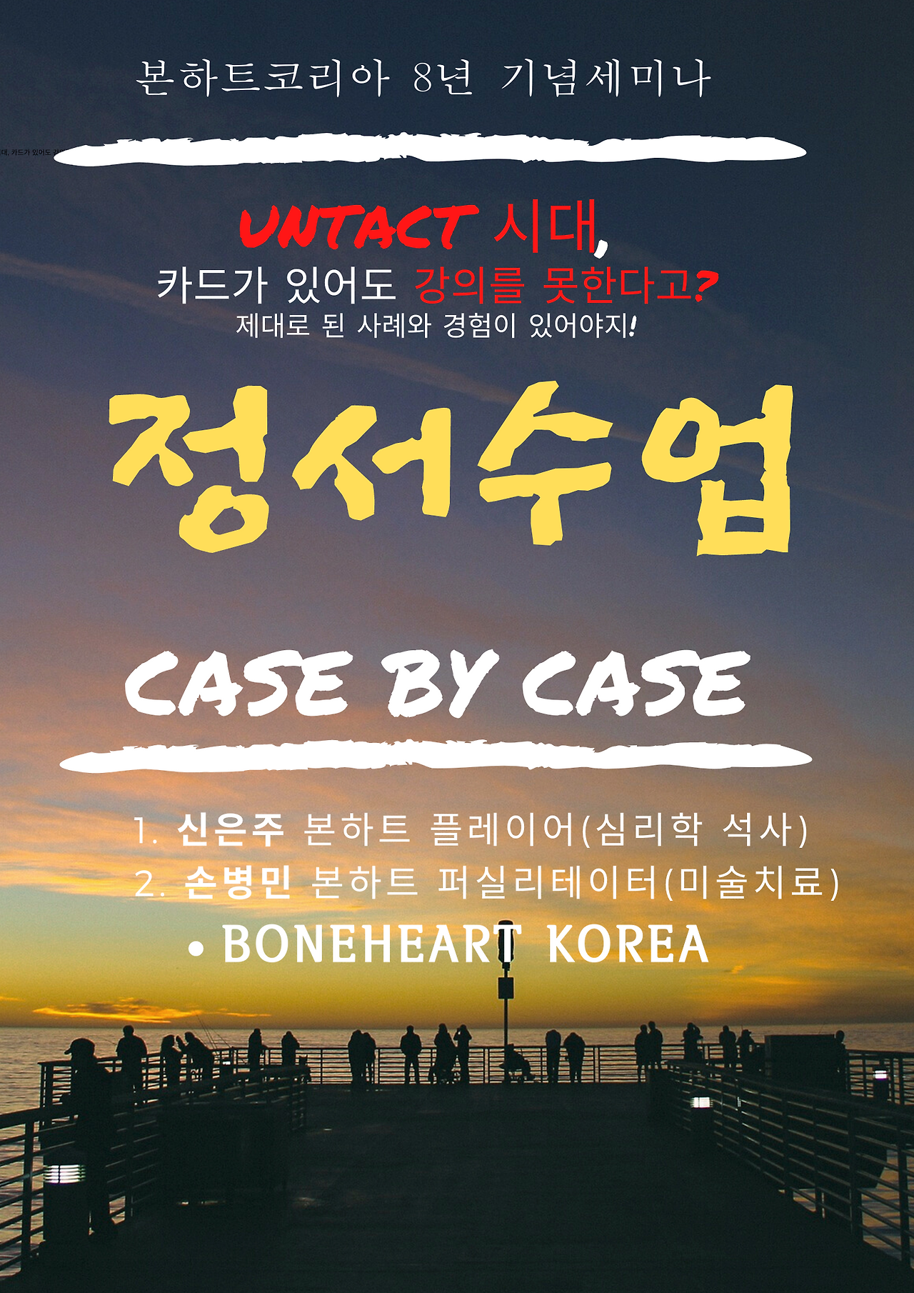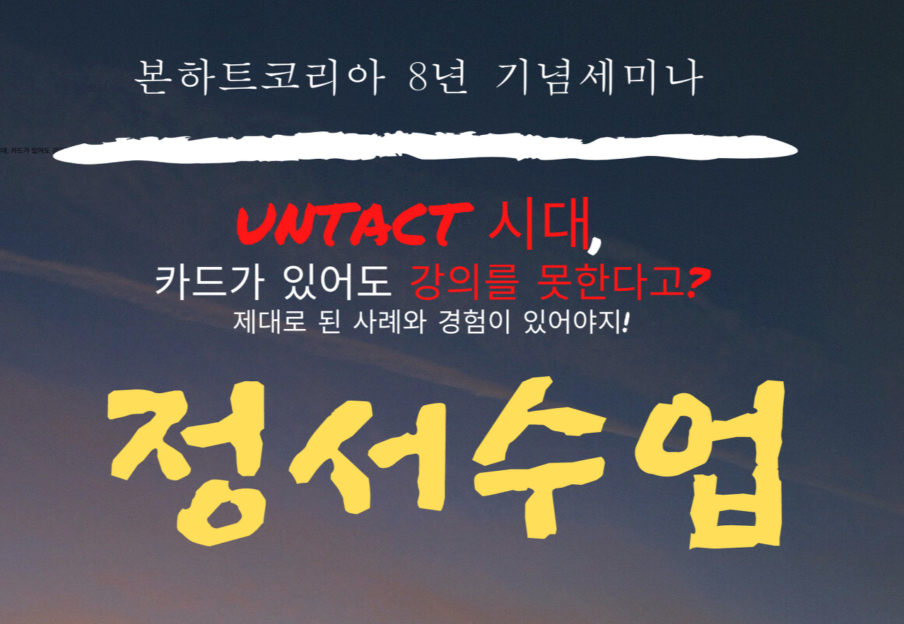 본하트 8주년 기념세미나 '정서수업' 사례발표 어느덧 본하트 8주년이 되었습니다. 도와주신 분들을 모시고 조촐한 자리를 마련했습니다. 그동안 정서수업을 진행했던 선생님들이 사례발표를 하는 자리를 갖고자 합니다. 감정, 정서, 어떻게