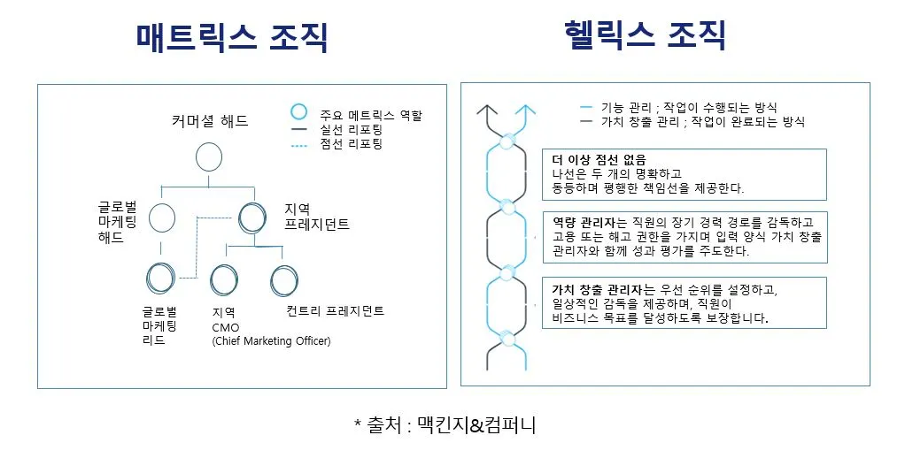 그런데 빠르게 변화하는 분야일수록 애자일 경영에 성공하기가 쉽지 않다. 애자일의 단점을 보완한 형태인 헬릭스 조직을 효과적으로 운영하기 위해서는 각 직원이 어떤 역량을 갖추고 어떤 지식을 보유했는지 정확하게 파악해야 한다. 그래야 리더들이 소규모 조직을 구성할 때 인적자원을 효율적으로 배분할 수 있다. 오히려 구성원의 역량을 잘 모르면 업무분장에서 실패할 수 있다. 헬릭스 경영의 단점은 잘못된 업무 배정과 리더들의 역할이 잘 수행되지 않을 때는 오히려 기존 애자일 조직보다 신속하게 대응하지 못할 수 있다는 것이다.