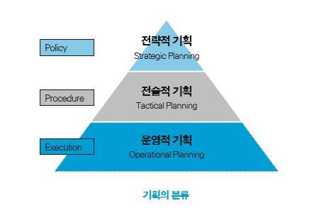 전략적 기획(Strategic Planning)이란 기업이 조직의 목표를 효과적으로 달성하기 위해 장기간에 걸쳐서 수립하는 전체적인 큰 그림을 말한다. 이에 비해 전술적 기획(Tactical Planning)이란 전략에 비해 구체적으로 실천하기 위해 그때그때 달라지는 행동 대책을 말한다. 중요한 기획서는 무작정 쓰는 것이 아니라 전략적 기획이 된 후에야 작성이 가능하다. 공조직인 경우에는 전략적 기획과 전술적 기획을 합쳐서 정책적 기획을 한다. 정책적 기획(Policy Planning)이란 조직의 상층부에서 이루어지는 거시적 목표와 가치판단으로, 우선순위를 결정하는 과정이다. 마지막으로 운영적 기획(Operational Planning)이란 정책기획에서 설정된 목표를 구체적으로 실행하기 위해 중하부에서 이루어지는 관리 차원의 기획을 말한다.