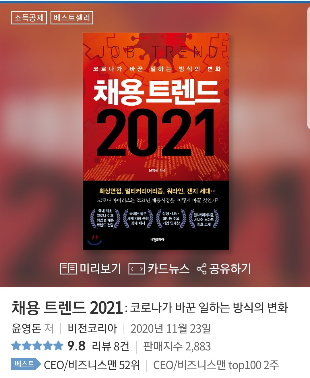 화요일에 유튜브 라이브 많이 했는데 [채용트렌드 2021] 저자 특강은 두 번째입니다. 오늘 예스 24 판매지수 2883을 껑충 뛰었습니다. ~♡♡