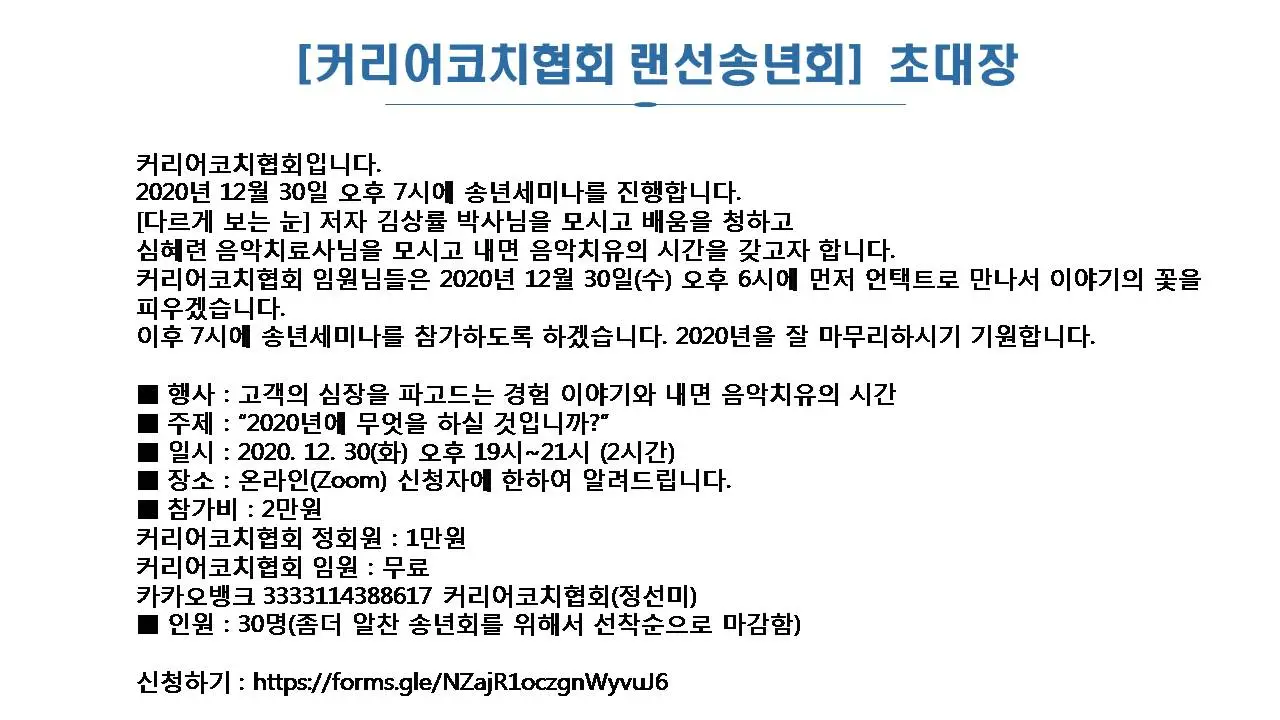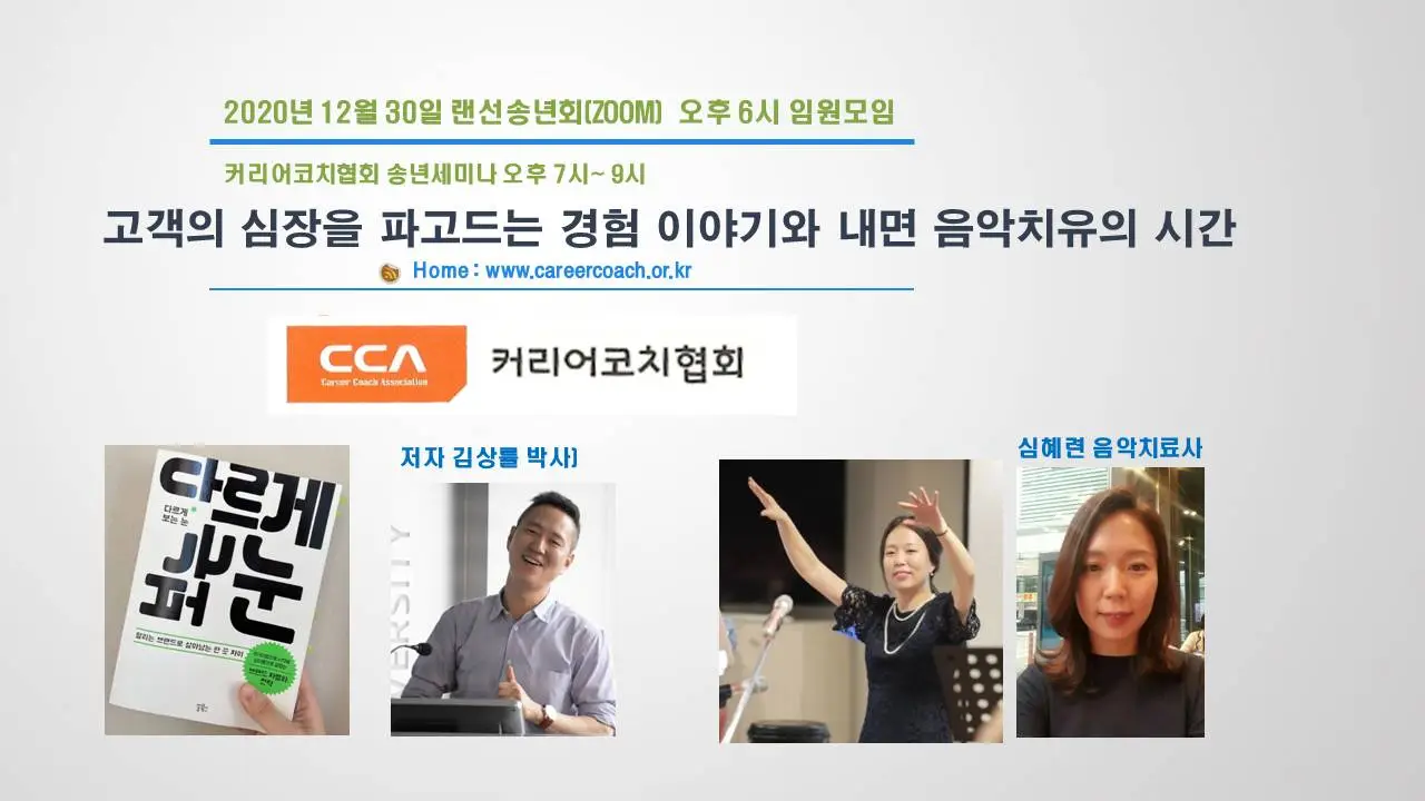 커리어코치협회 랜선송년회 커리어코치협회입니다. 2020년 12월 30일 오후 7시에 송년세미나를 진행합니다. [다르게 보는 눈] 저자 김상률 박사님을 모시고 배움을 청하고 심혜련 음악치료사님을 모시고 내면 음악치유의 시