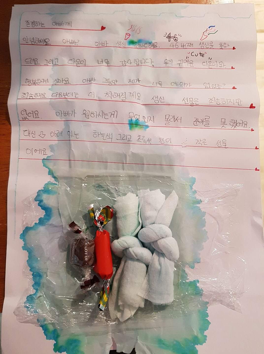 안녕하세요. 아빠! 아빠 생신 축하드려요. 생신을 축하드려요. 그리고 다온이 너무 감사합니다. 우리 귀여운 다온이와 행복하게 살아요. 아빠 그동안 제가 너무 예의가 없었죠? 죄송해요. 다음부터 더 착해질 께요. 생신 선물은 죄송하지만 없어요. 아빠가 원하시는 게 무엇인지 몰라서 준비를 못했어요. 대신 아래 있는 하늘색 그리고 초록색 천이 작은 선물이에요.