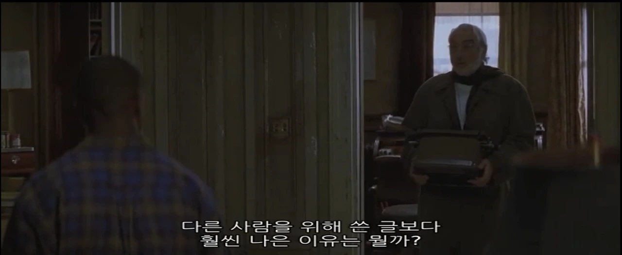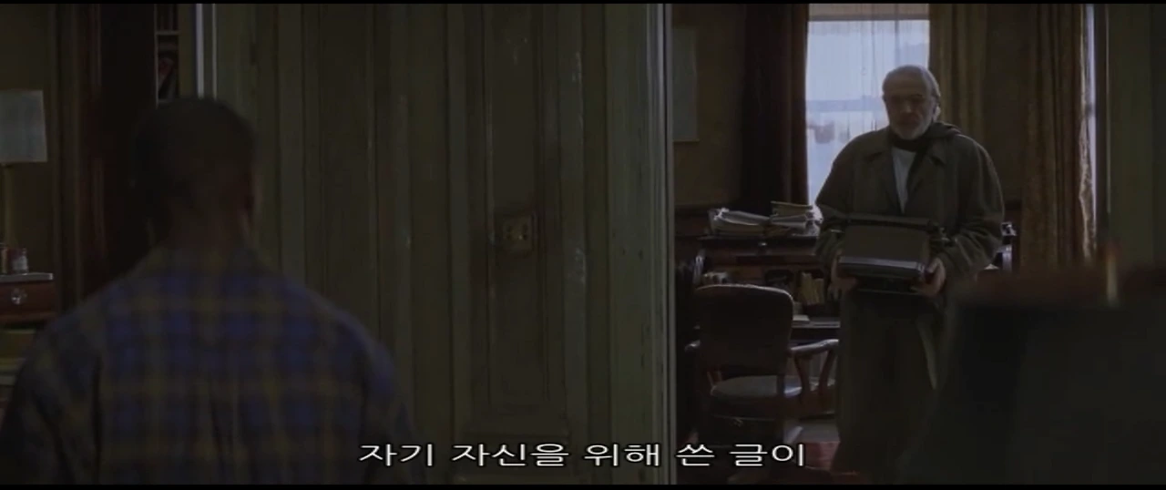 이 영화는 두 사람이 아무 대화 없이 타자기를 두드리고 음악을 듣는 실내 시퀀스가 인상적이다. 때 묻은 고전서적들과 정적만이 가득했던 포레스터의 은둔지가 어느새 글쓰기 교실이 된다. 외롭고 의미 없는 삶을 살던 포레스터는 지식 공동체에서 나아갈 방향을 제시해주는 스승이 되고 불안하고 방황했던 자말은 제자가 된다. 우리말로는 교학상장하는 모습이 아름답다. 포레스터는 이 어린 제자를 따라 지난 40여 년간 닫고 살아온 창 밖의 세상에 조금씩 만나고, 자말은 위대한 작가로부터 포기할뻔한 글쓰기를 다시 꿈꿀 수 있게 된다.