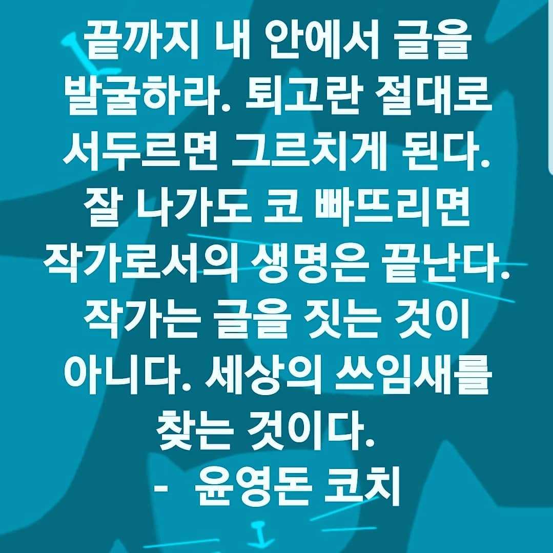 끝까지 내 안에서 글을 발굴하라. 퇴고란 절대로 서두르면 그르치게 된다. 잘 나가도 코 빠뜨리면 작가로서의 생명은 끝난다. 작가는 글을 짓는 것이 아니다. 세상의 쓰임새를 찾는 것이다. - 윤영돈 코치