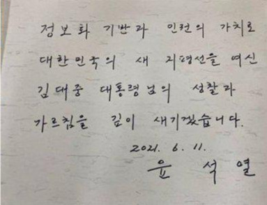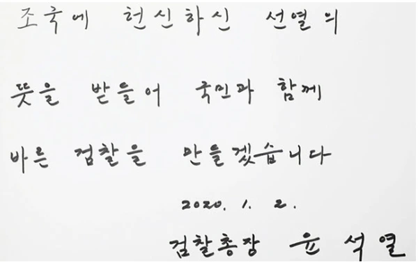 윤석열 후보자의 글씨는 우선 어린 아이와 같다. 글씨의 멋보다는 곧은 선들이 순수함이 보인다. 글씨의 세로 획이 가로 획보다 길고 끝이 점점 굵은 것이 특징이다. 검찰총장에서 검의 글씨 중에 ㅁ자를 보면 돈이 들어왔다가 금방 세어나가는 타입이다. 즉 오픈마인드를 가지고 있고 자신의 것을 챙기지 않기 때문에 주변이 관계는 좋으나 필적학적으로 보면 실질적으로 돈이 셀 수 있다고 한다. 필압이 전체적으로 힘이 느껴지는 글씨다.