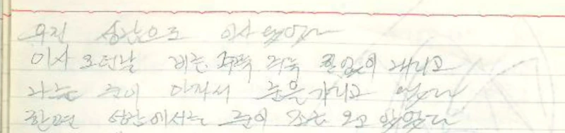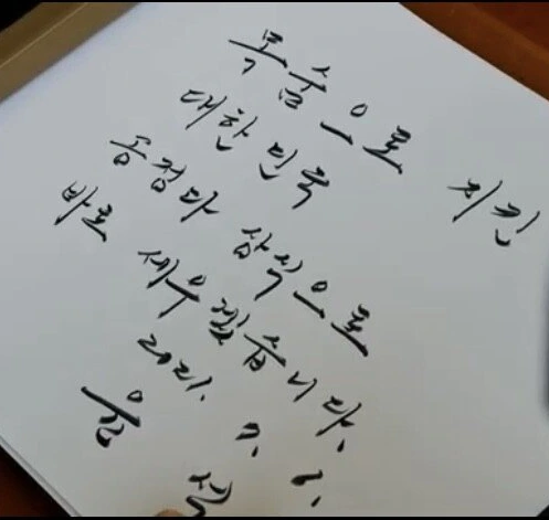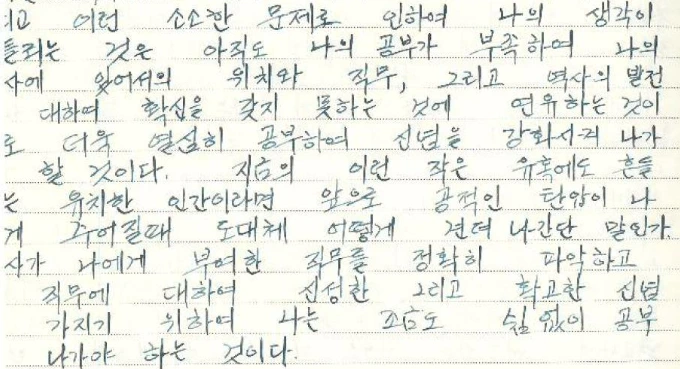 여기서도 ㅁ자와 ㅇ자 앞이 열려 있고, ㅣ자가 곧게 쓰는 것은 고집스러움이 보인다. 앞의 글씨보다는 좀더 빠르게 쓸려고 하는 움직임이 있다. 최근 마음이 바빠지고 있는 것으로 보인다.