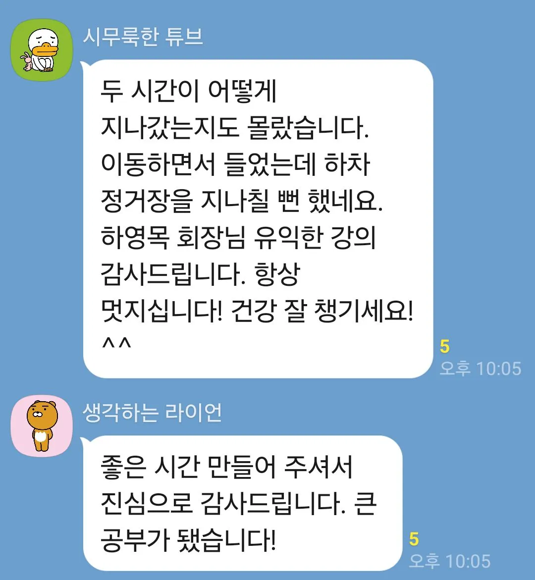 "두 시간이 어떻게 지나갔는지도 몰랐습니다. 이동하면서 들었는데 하차 정거장을 지나칠 뻔 했네요. 하영목 회장님 유익한 강의 감사드립니다. 항상 멋지십니다! 건강 잘 챙기세요! ^^"