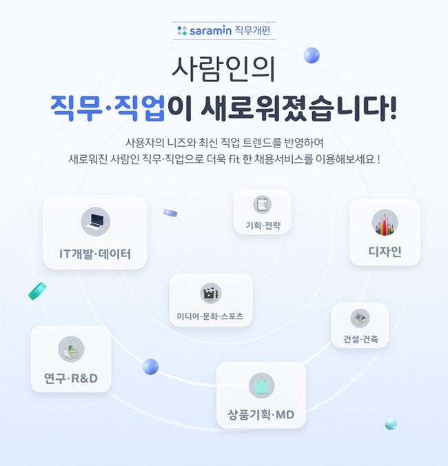 직무 중심의 채용’이 취업 시장의 대세가 되면서, 원하는 직무에 맞는 채용 정보를 얻으려는 사용자들의 니즈도 커졌다. 사람인도 직무에 특화된 서비스 제공을 위해 ‘직무 카테고리’를 개편했다.