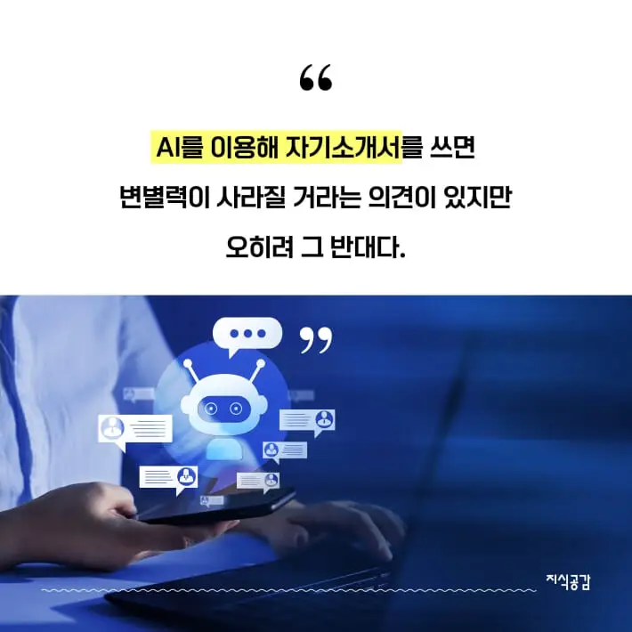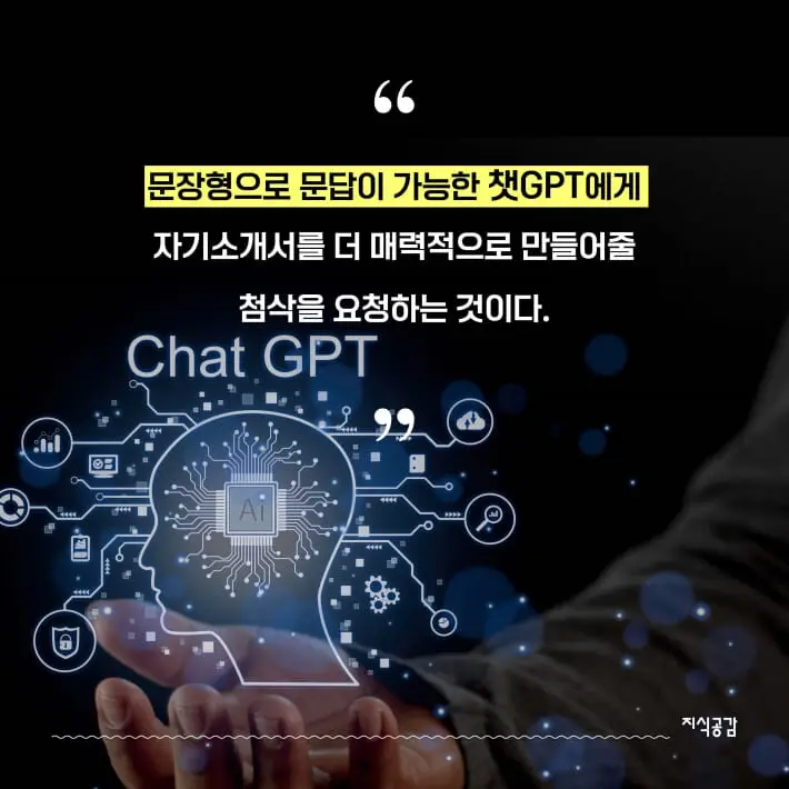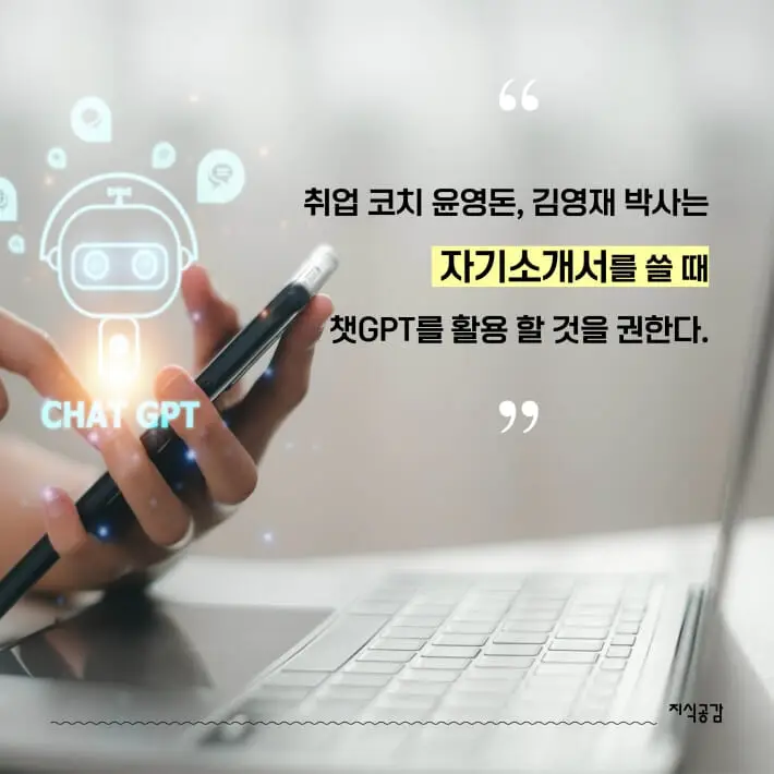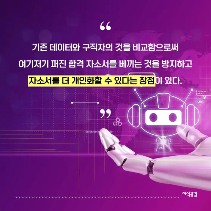 챗GPT의 활용 범위가 확대되면서 이제는 취업 준비에도 영향을 미치고 있다. 그전에도 지원자의 자기소개서를 검토하는 데 AI가 사용되었다. 합격 자소서를 베끼진 않았는지, 표절률이 얼마나 되는지 측정하기 위함이었다. 채용 시 기업에서나 이용하는 것으로 인식되었던 AI는 취업을 준비하는 지원자들에게도 중요한 요소로 다가오고 있다.