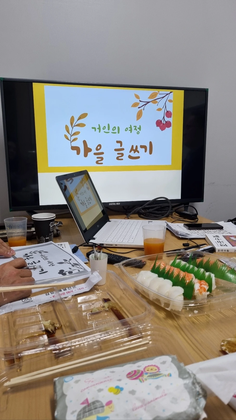 오붓하게 첫 모임을 시작했습니다. 처음에는 그냥 리더 없이 진행되는 걸로 알고 있었는데 윤영돈 교장선생님께서 PPT 자료도 출력해 주시고 피가 되고 살이 되는 글쓰기 강의를 해주셨어요.^^ 오히려 리더가 있으니 중심이 잡히는 듯한 기분이 들었습니다. 감사합니다. 윤영돈 교장선생님. 물론 맛있는 초밥과 음료를 준비해주신 강은영도반님과 함께 말씀 나눠주신 이은숙도반님도 함께 할 수 있어서 너무 좋았답니다.