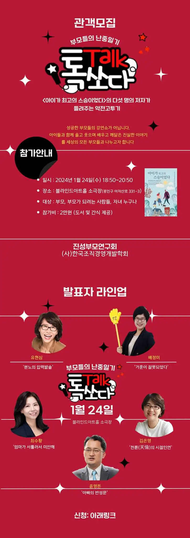 [ �톡쏘다] 제1회 <아이가 최고의 스승이었다> 저자 북세미나 제1회 [�톡쏘다] 북세미나에 여러분을 초대합니다. “진성부모는 어떻게 아이를 구해냈을까?” “아이는 어떻게 삶의 주인이 되었을까?” 진정 올바른 부모의 역할이 무엇인지 궁금한 초보 부