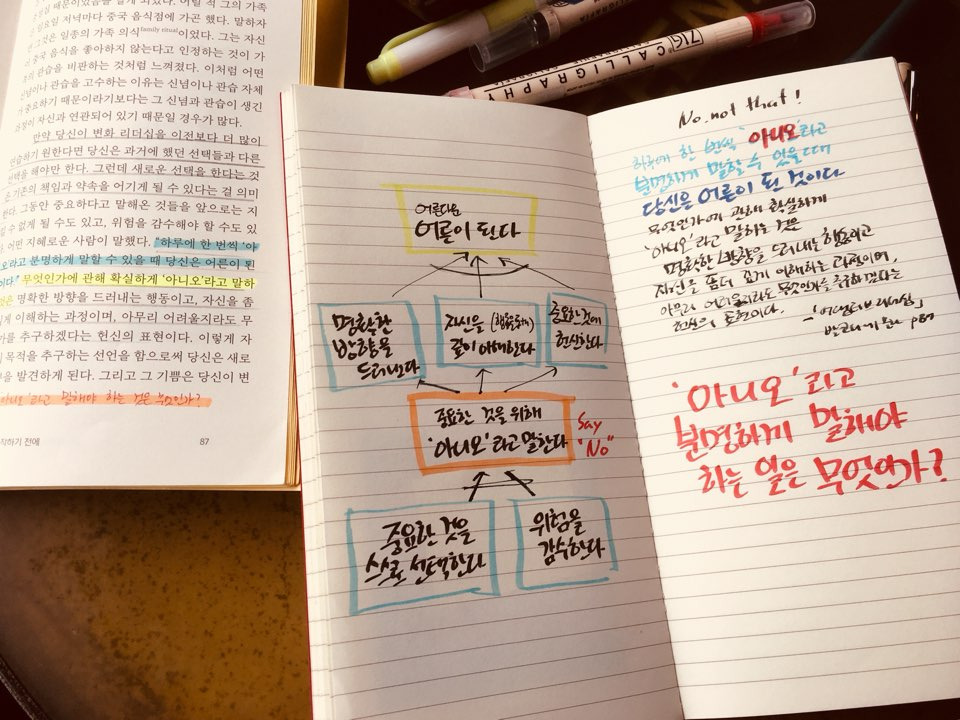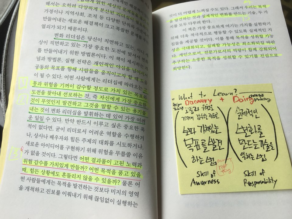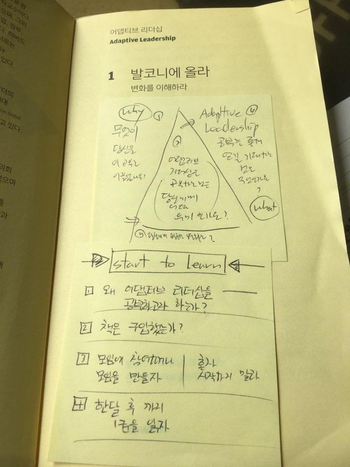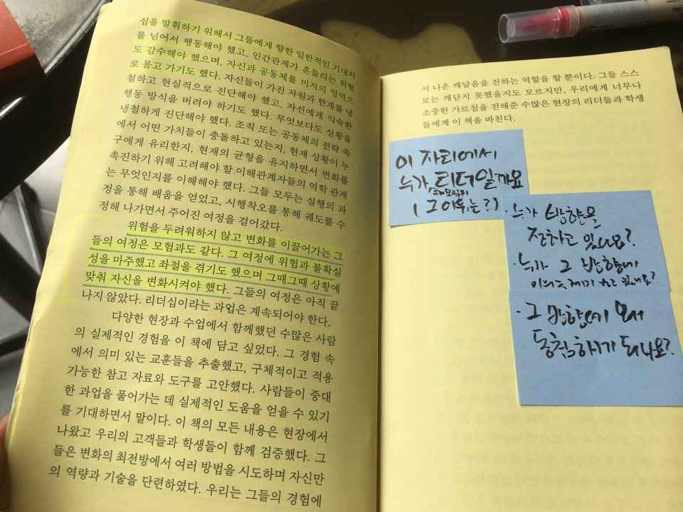 고등학교 때 서점에서 어느 사회과학 도서에서 ‘책은 노예다’ 문장을 읽었다. 책을 잘 모셔놓는 것이 아니라 책을 접거나 밑줄을 긋고 동그라미를 치고 한다. 요즘도 책이 깨끗하게 보는 사람을 보면 저 사람은 천재인가보다 생각한다. 저자가 책을 쓰면서 질문이 무엇인가? 독자에게 해주는 질문이 무엇인가? 저자의 질문은 빨간색으로 밑줄을 긋고, 내가 답해야 할 것은 포스트에 적어본다. 그 문장이 마음에 들으면 손글씨로 적어보고 사진을 찍어서 SNS에 공유한다. 책을 읽을 때에는 머리말과 맺음말을 읽어보고 진심이 읽혀지면 그 다음에 본문을 읽는다. 머리말에는 작가의 문제의식이 바로 질문에서 나타난다. 맺음말에는 작가의 당부가 담겨 있다. 독후 질문을 해보는 것도 좋다. 실용도서는 빠르게 훑어보고 문학작품은 손 가는 데로 전부 읽는다. 예를 들면 『어댑티브 리더십(Adaptive Leadership)』에서 ‘방 안의 코끼리(elephant in the room)’의 작가 의도가 무엇일까? 함께 답해야 할 질문이 무엇인가? 코끼리가 떡하니 방 안에 버티고 있는데도 오랫동안 존재를 무시하거나 애써 외면하다 보면 정말 없는 것처럼 느껴진다는 것이다. 예를 들면 글쓰기 신공이 뭘까? 신공의 의미가 무엇일까? 피터 센게에서 학습조직이 의미하는 게 무엇일까? 오래도록 살아남는 기업에는 어떤 특징이 있는가? 책을 읽고 진짜 학습은 바로 질문을 던지는 순간이다.