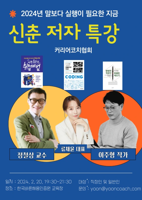 2024년 2월 20일(화) 오후 7시 30분부터 9시 30분까지 저자특강을 진행합니다. 토크식 형태로 진행됩니다. 30분씩 연사가 강의를 하고, 나머지 30분은 토크식 형태로 책에서 들어볼 수 없는 이야기를 함께 나눕니다. 커리어코치협회 임원님들은 오후 7시에 먼저 오프라인에서 만나서 이야기의 꽃을 피우겠습니다. 이후 7시 30분에 신춘저자특강을 참가하도록 하겠습니다.
