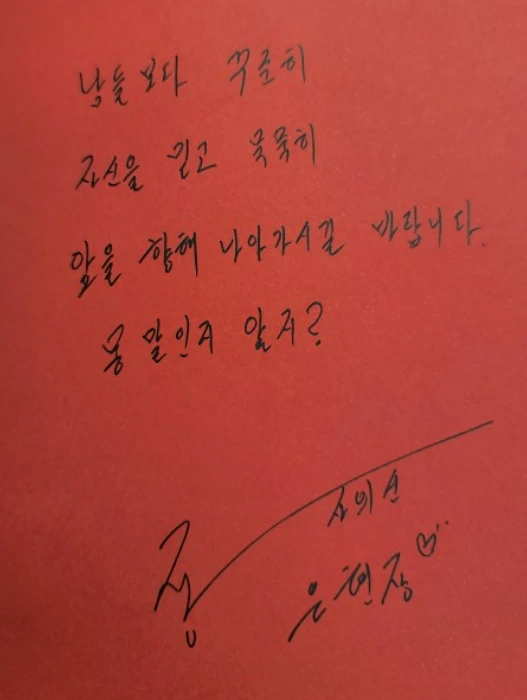 은씨의 글씨는 우상향으로 긍정적인 성격이 반영되어 있다. 특히 'ㅁ'가는 위가 열려 있고, 아래는 닫혀 있어서 재물을 모으는데 능숙하다.