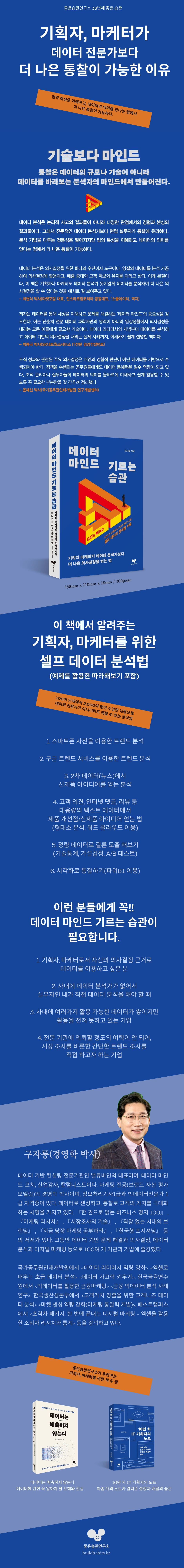 이런 실무자가 데이터 마인드(나아가 분석력)까지 갖춘다면 막강한 경쟁력을 갖추는 것과 다름없습니다. 데이터 분석 경험도 별다른 기술도 없는 기획자 마케터가 ‘가장 기초적인 수준’에서 데이터 분석을 해볼 수 있는 방법을 알려줍니다. 부록으로 챗GPT를 이용한 분석법까지 담았습니다.