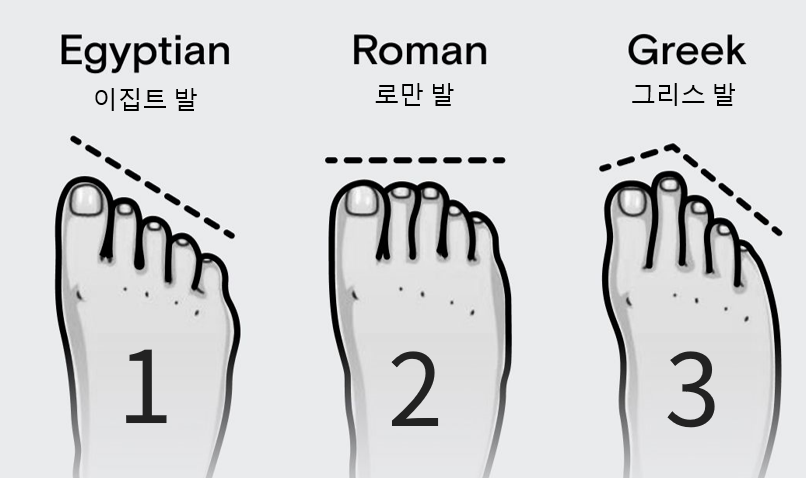 발은 인체의 축소판이다. 발은 제2의 심장으로 불릴 만큼 중요한 신체 부위이다. 발의 뼈는 인체 전체 뼈의 25%를 차지한다. 발은 26개의 뼈와 33개의 관절, 94개의 근육으로 아치를 형성해 우리 몸을 지탱하고 균형을 유지하는 중요한 기관이다. 발은 신체의 모든 신경기관과 연결되어 있으며, 심장을 도와 혈액순환을 돕다. 다음 3가지 중에 하나만 선택해본다. 당신은 어느 발가락이 더 긴가?