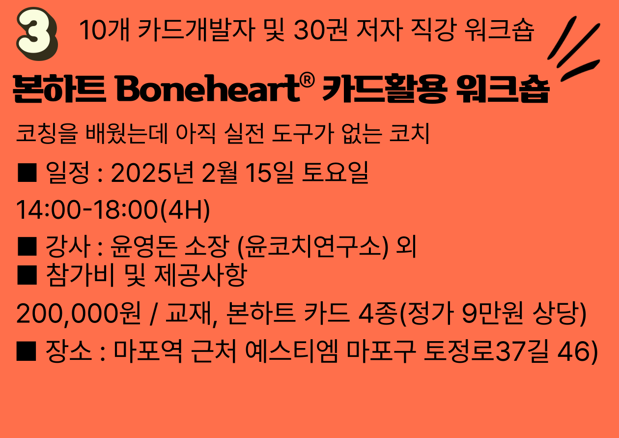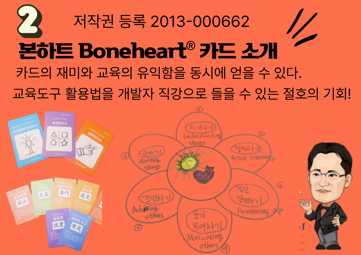 교육도구의 활용법을 개발자 직강으로 들을 수 있는 절호의 기회! 카드의 재미와 교육의 유익함을 동시에 얻을 수 있다. - ‘당신은 어떤 사람으로 기억되고 싶은가?’ 리멤버카드로 질문하게 한다. 소질카드를 활용하여 자신의 강점을 발견하고 업무프로세스를 개선할 수 있다. - 역량카드로 직무에 따른 핵심역량을 발견하고 조직 성장에 기여할 수 있다. 정서카드를 활용하여 동기부여 및 공감을 도울 수 있다. 사람에게 감성이 있어야 창의성도 생긴다. 세계적인 기업들은 ‘지식형 인재’가 아닌 ‘감성형 인재’로 키우기 위한 노력을 한다. - 국내 기업 교육의 혁신을 이끌고 있는 교구 BoneHeart® 카드는 세계적인 500대 기업에서 자주 쓰는 역량모델을 기초로 하여 한국 정서에 맞는 54가지 역량을 엄선해서 활용하기 쉽다. 본하트 카드는 교육, 코칭, 상담, 회의, 면접, 평가, 모임 등에서 다양한 방법으로 활용 가능하게 설계되어 있다. BoneHeart®에서 제공하는 워크숍을 통해서 다양한 역량카드 활용법을 익힐 수 있다. [특허청 등록 41-2012-0017026 / 저작권 등록 2013-000662]