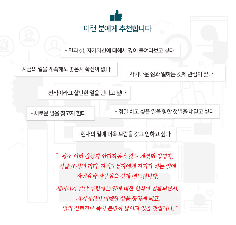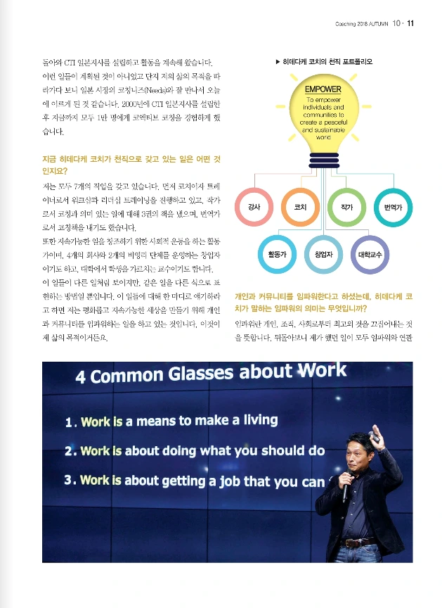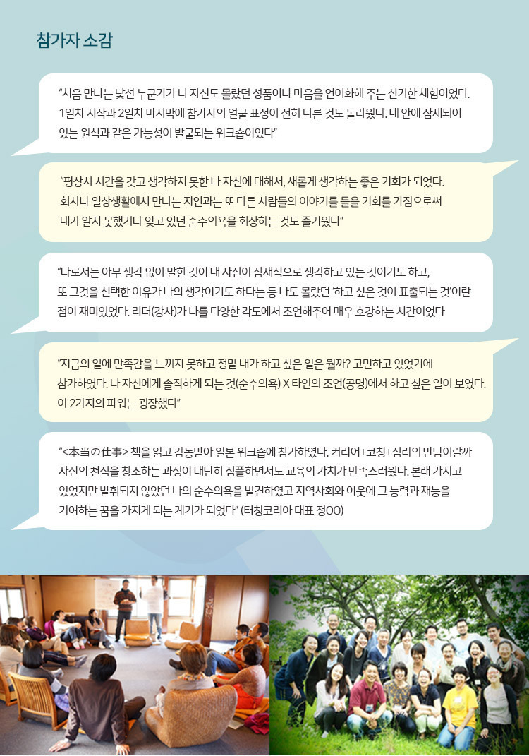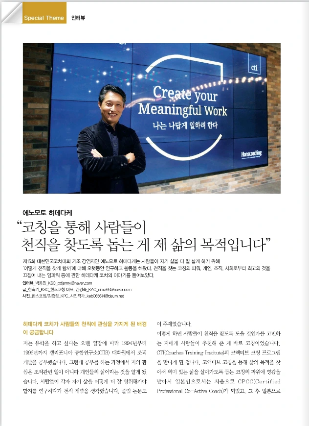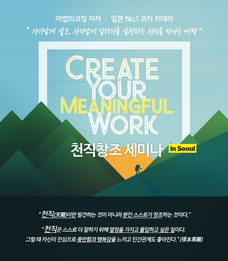 토츠바시대학교 법학부 졸업 후 ㈜리쿠르트 입사. 인사, 영업, 기획, 신규사업개발 등담당. 1994 년에 회사를 퇴직 후 미국 샌프란시스코에 있는 California Institute of IntegralStudies(캘리포니아 통합대학원)에서 조직개발 및 변화학을 배우고 1997 년에석사학위를 받았다. 이때의 석사 논문 제목이 로 그 논문 내용에 기초하여 개발된 것이 <천직창조세미나>.미국 유학 중에 CTI (The Coaches Training Institute)에서 코칭을 배우고, 1996 년에는일본인으로는 처음으로 전문 코치의 자격을 취득. 귀국 후 천직창조세미나 및 코칭을통해 일과 삶으로 고민하는 수천 명의 사람들을 지원해왔다. 2000 년에는 CTI Japan 을설립하여 CTI 의 코칭 프로그램을 제공하면서 일본 내 코칭 보급에 공헌.이후, 2005 년부터 2008 년까지 영국에 거주하며 CTI 의 유럽 각국에 진출을 지원하는동시에 지속 가능한 미래를 만들기 위한 활동을 모색. 2008 년 귀국 후 Transition Japan,Seven Generation 이라는 2 개의 NPO 단체를 설립하였고 각각 세계 적 규모의시민운동인 Transition Town 및 Change the dream 을 일본에 보급하는 일에 힘을 쏟아올해 그 10 주년을 맞이했다. 이러한 활동은 모두 개인과 지역사회를 임파워함으로 더나은 미래를 만드는 것을 목적으로 하고 있다는 점에서 공통점이 있다.2012 년에 YOKUIKIRU 연구소를 설립하고 지금까지 해왔던 일을 정리, 통합하고 나름대로의 형태로 발신하는 활동을 시작했다. 몇 년 전부터 중국을 비롯한 아시아 각국의활동에 힘을 쏟고 있다. 또한 이번 여름부터 동경에 신설된 22 세기형 비즈니스 스쿨인시젠칸대학교(大学院大学至善館) 전임교수로 부임.저서로는 ‘本当 の 自分 を 生 き ’ (2017), ‘本当 の 仕事’ (2014)、’마법의코칭’(1999), 기타번역에 ‘Active Hope’ (2005), ’Transition Handbook’ (2013), ’Coaching Bible’(2002)、’Virtual Teams’ (1998) 가 있다.《プロフィール》榎本 英剛(えのもと ひでたけ)一橋大学法学部を卒業後、株式会社リクルートに入社。人事、営業、企画、新規事業開発などに従事。1994 年に同社を退職後、米国サンフランシスコにある California Institute ofIntegral Studies(カリフォルニア統合大学院)にて組織開発・変容学を学び、1997 年に修士号を取得。この時の修士論文の題名が「Create Your Meaningful Work(意味のある仕事を創る)」で、その論文の内容にもとづいて開発されたのが「天職創造セミナー」。アメリカ留学中に CTI(The Coaches Training Institute)でコーチングを学び、1996 年には日本人として初めてプロ・コーチの資格を取得。帰国後、天職創造セミナーおよびコーチングを通して、仕事や人生に悩む数千人の人たちをサポートしてきた。2000 年には CTI ジャパンを設立し、CTI のコーチング・プログラムを提供することを通して、日本におけるコーチングの普及に貢献。その後、2005 年から 2008 年までイギリスに在住し、CTI のヨーロッパ各国への進出をサポートすると同時に、持続可能な未来をつくるための活動を模索。2008 年に帰国後、トランジション・ジャパンおよびセブン・ジェネレーションズという2つの NPO団体を設立し、それぞれ世界規模の市民運動であるトランジション・タウンおよびチェンジ・ザ・ドリームを日本に普及することに務め、今年その 10 周年を迎えた。これらの活動はすべて個人やコミュニティをエンパワーすることでより良い未来を創ることを目的としている点で共通している。2012 年にはよく生きる研究所を設立し、これまでやってきたことを整理・統合し、自分なりの形で発信していく活動を開始。数年前から中国を始めとしたアジア諸国における活動に力を入れている。また、この夏から新たに東京に新設された 22世紀型のビジネススクールである大学院大学至善館の教授に就任。著書に『本当の自分を生きる』(2017 年、春秋社)、『本当の仕事』(2014 年、日本能率協会マネジメントセンター)、『部下を伸ばすコーチング』(1999 年、PHP 研究所)、その他翻訳に携わった書籍に『アクティブ・ホープ』(2015 年、春秋社)、『トランジション・ハンドブック』(2013 年、第三書館)、『コーチング・バイブル』(2002 年、東洋経済新報社)、『バーチャル・チーム』(1998年、ダイヤモンド社)がある。
