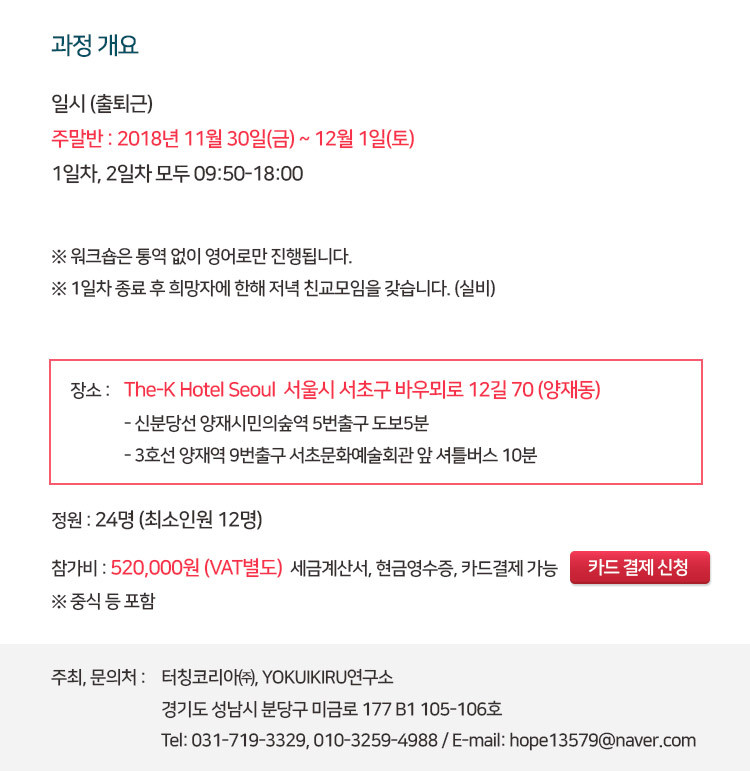 이제껏 읽을 책 중에 코칭 책으로 무엇을 추천할 것인가? 라는 물음에 저는 [마법의 코칭](에노모토 히데다케, 새로운제안)을 추천할 것입니다. 마법의코칭 저자, 2018 대한민국코치대회 기조강연 <일과 삶의 진정한 조화>의 에노모토 히데다케 교수가 진행하는 영어 워크숍을 안내드립니다. 저도 영어를 그리 잘 못하지만 이번 워크숍에 참여할 예정입니다. 이번 워크숍을 한국에 소개하는 회사는 (주)터칭코리아입니다. 이 회사의 대표님이 정영희 코치님이십니다. 하영목 박사님과 제가 진행하는 커리어코치 전문가 1기 과정을 10년 전에 들을 것을 기억하더군요. 이 과정은 <의미있는 일 만들기> CMW워크숍입니다. 일정은 11/30(금)-12/01(토)에 있을 것입니다. 신청바로가기 https://goo.gl/forms/JvTgff85qgTUsukN2