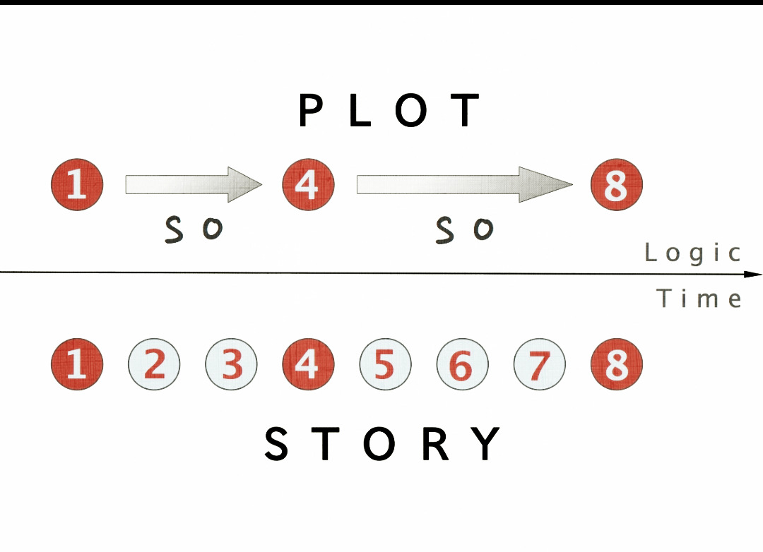 좀 더 단순화하면 스토리는 시간적 개념이라면 플롯은 논리적 개념이다. '플롯'이라는 용어는 이야기에서 미래의 행동을 계획하는 성격을 나타내는 동사로 사용될 수 있다.