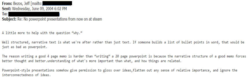 2004년에 베조스가 S팀 회의에서 PPT를 폐기하고 그 이유를 설명하는 이메일을 보냈다.