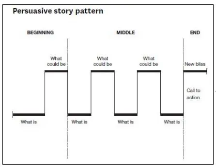내러티브(Narrative)는 ‘말하다’라는 뜻의 라틴어 동사 "narrare"에서 유래한 단어다. 내러티브는 인과 관계로 엮인 이야기다. TED 위대한 연설의 비밀 강연자 낸시 듀 아르트(Nancy Duarte)는 "프레젠테이션에서의 스토리텔링은 주의를 집중시키고 주의를 기울이고 신념을 변화시키는 강력한 방법"이라고 말한다. 그녀는 시간이 지남에 따라 서스펜스를 만드는 우리가 좋아하는 책과 영화에서 예제를 제공한다. 이야기는 공감과 다른 감정적인 반응을 일으키는 좋은 방법이기도 한다. 전통적인 PowerPoint 글머리 기호로는 이를 달성하기 어렵다. 이제는 스토리 패턴으로 구조화하여 그래픽으로 접근해야 한다. 설득적인 스토리 패턴은 어떻게 시작해서 어떻게 끝나는가에 달려 있다.