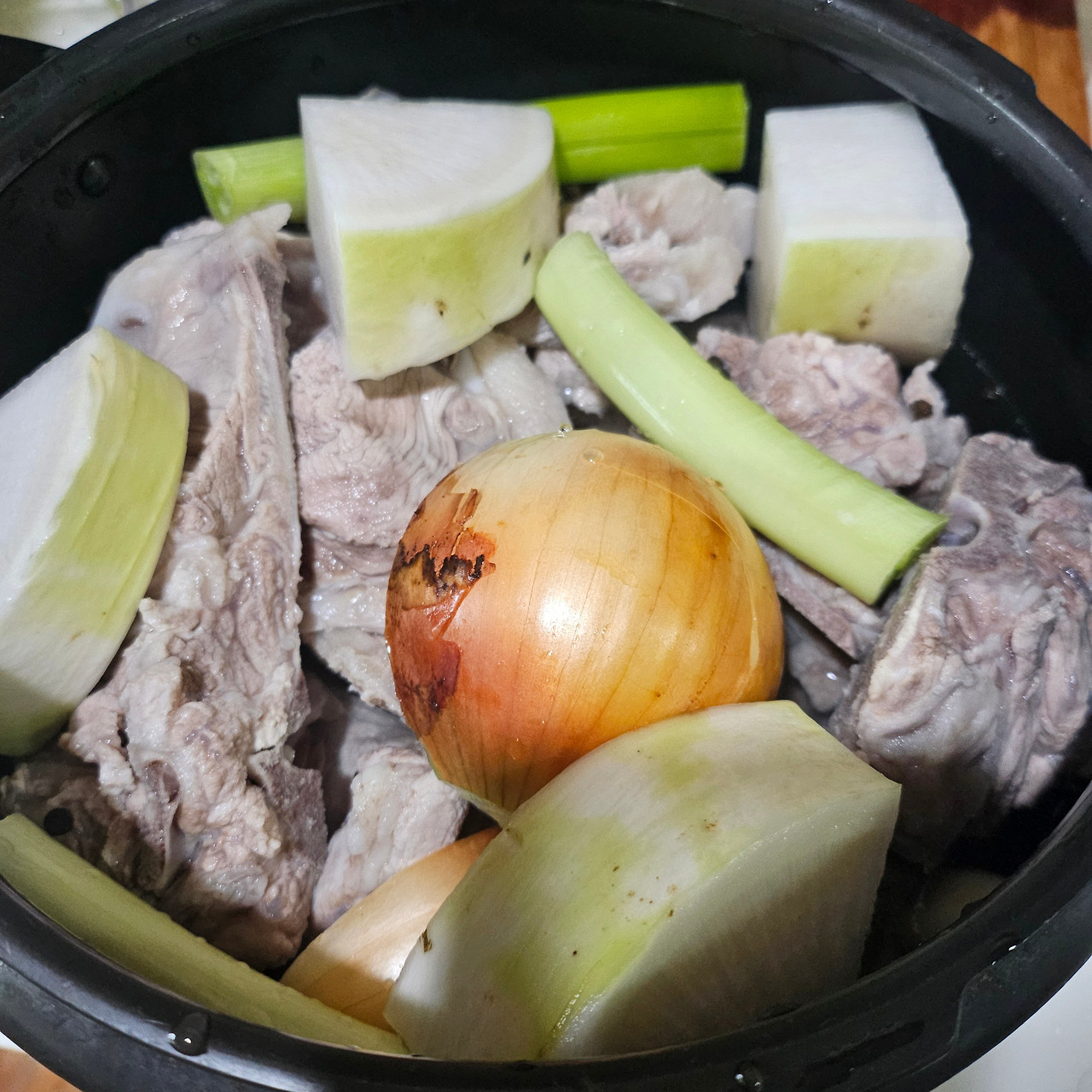 4. 압력솥에 3의 등뼈와 껍질을 벗기지 않은 양파, 대파, 통마늘 한 줌, 통후추를 넣고, 물에 된장 한 큰술을 풀어 넣고 삶아준다. 커피나 청주도 함께 넣어주면 잡내 제거에 도움이 된다.