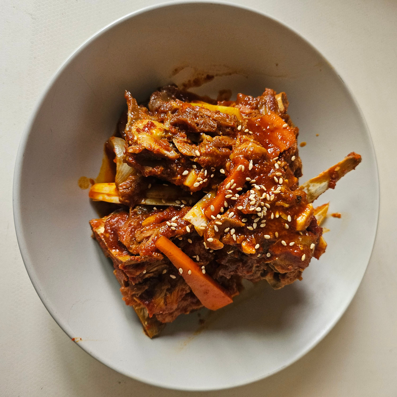 7. 국물이 어느 정도 없어질 때까지 조려준 후 통깨를 뿌려 마무리하면 등뼈찜이 완성된다.