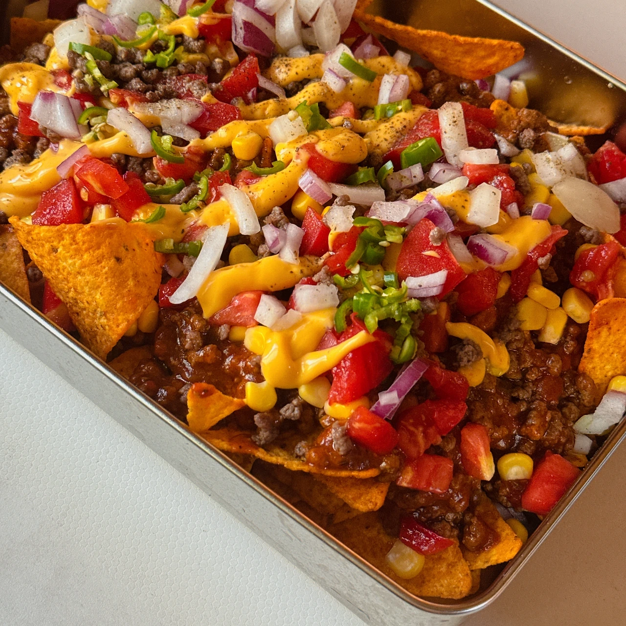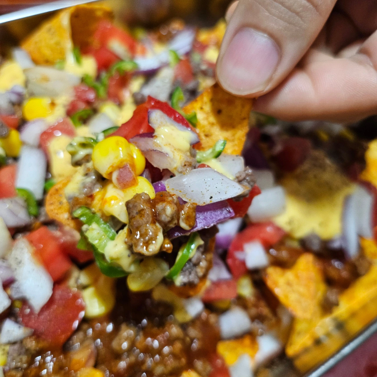 5. 토마토와 청양고추, 물기를 제거한 양파와 스위트콘을 보기 좋게 도리토스 위에 올려준다.