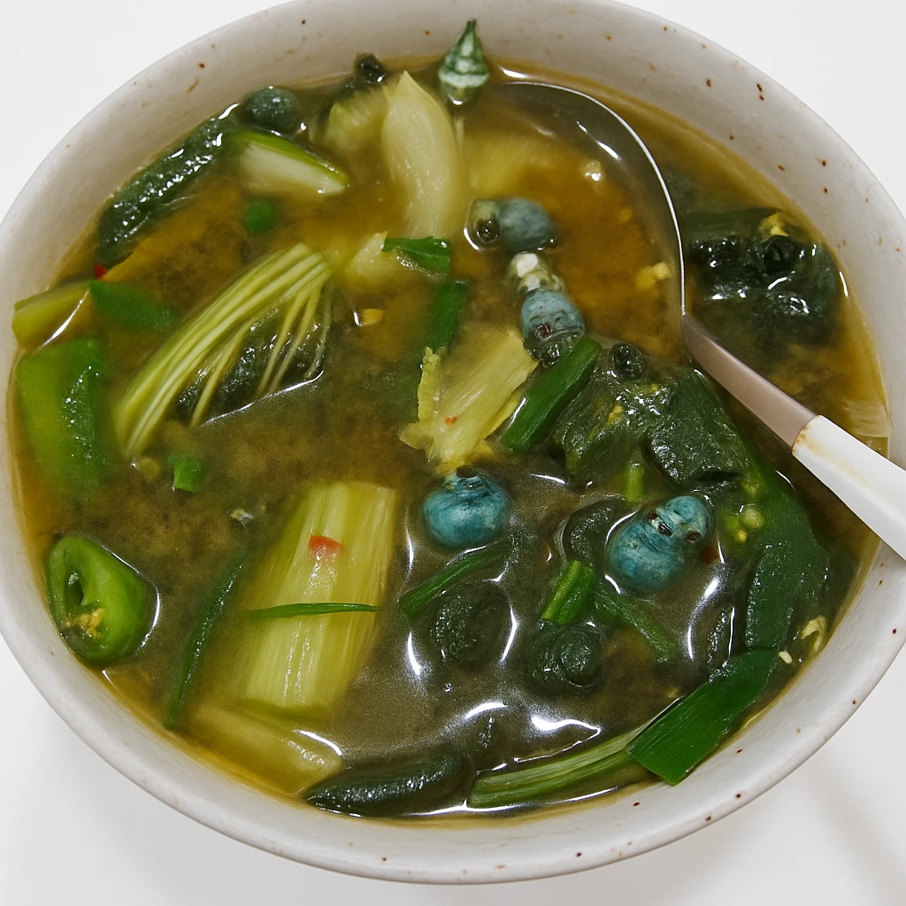 직접 끓인 해장국. 테이블이 지저분해 챗gpt에게 부탁했더니 이렇게 만들었다. 휴.