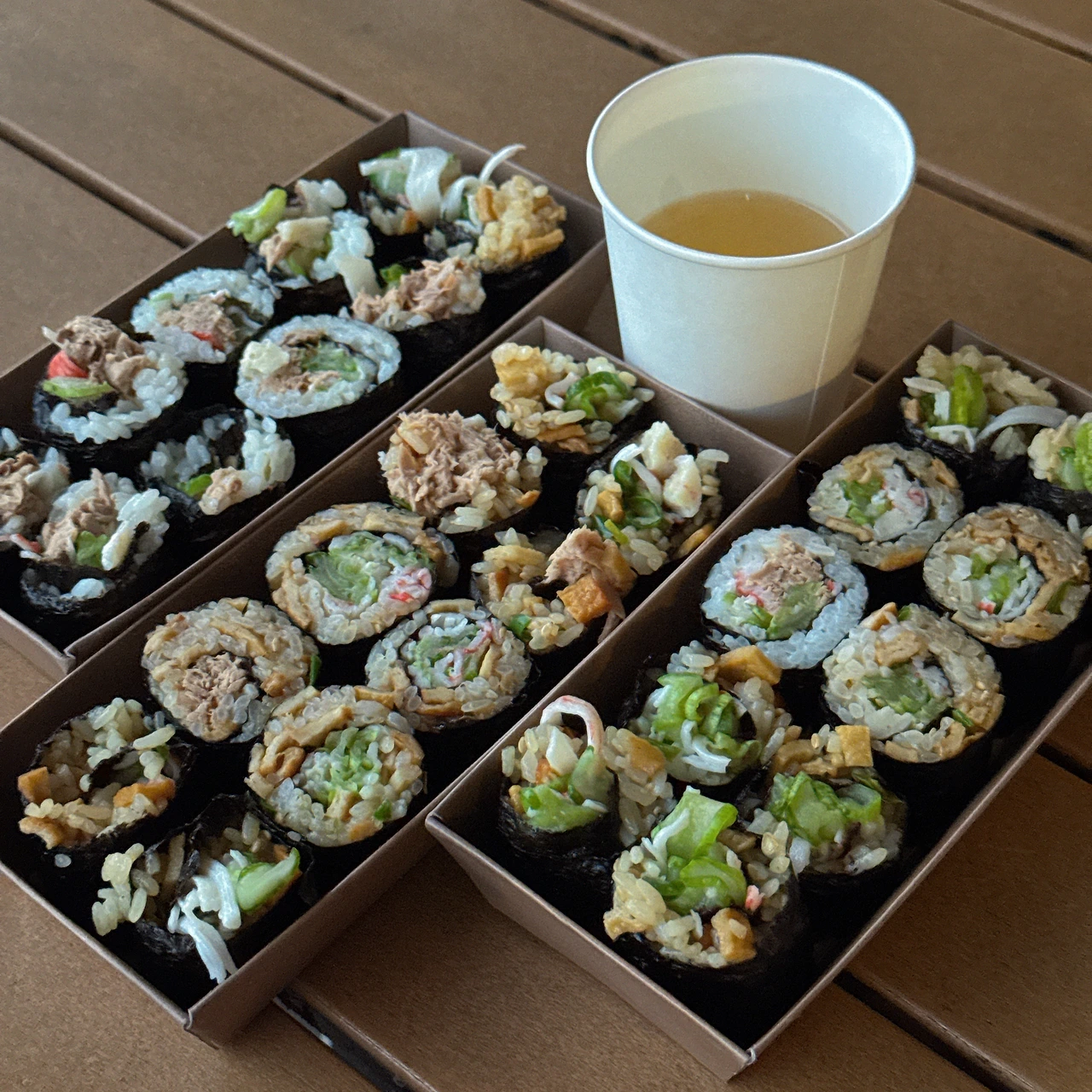 김을 반으로 자르면 크기가 작아지기 때문에 김발이 없어도 누구나 쉽게 말 수 있다. 완성된 김밥은 고추냉이를 살짝 섞은 마요네즈를 찍어 먹으면 훨씬 맛이 좋다.