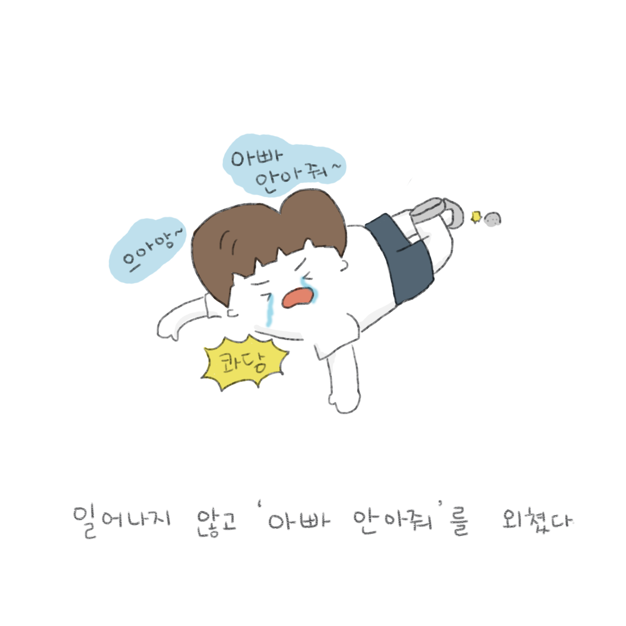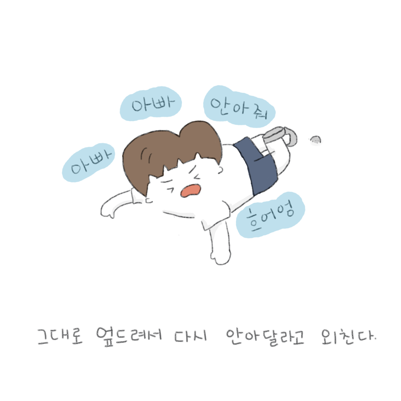 잘 놀다가 혼자 넘어지면 엉엉 울면서 아빠 안아줘를 외쳤대요. 얼른 누군가가 와서 일으켜 놓으면 다시 넘어졌던 자리로 돌아가서 그대로 엎드려서는 아빠 안아줘를 외치면서 울었다고 합니다...