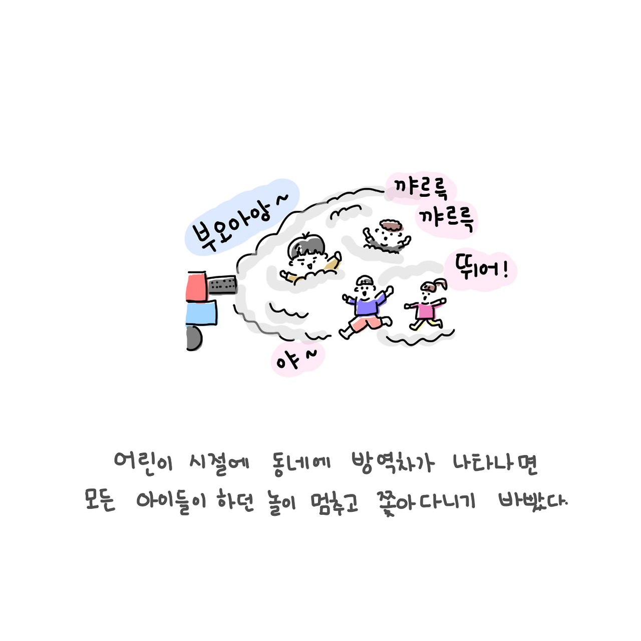 어릴 때 방역차가 등장하면 동네의 모든 아이들은 약속이라도 한 듯 방역차를 우르르르 쫓아다녔어요.