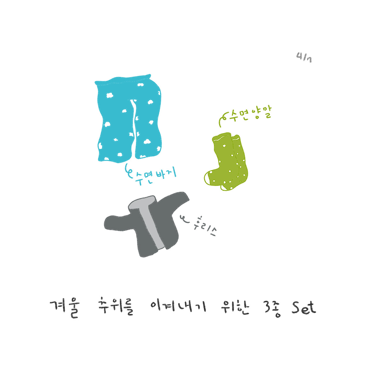 수면바지 + 플리스 + 수면양말을 입어주면 포근 따듯한 느낌이 너무 좋아요.