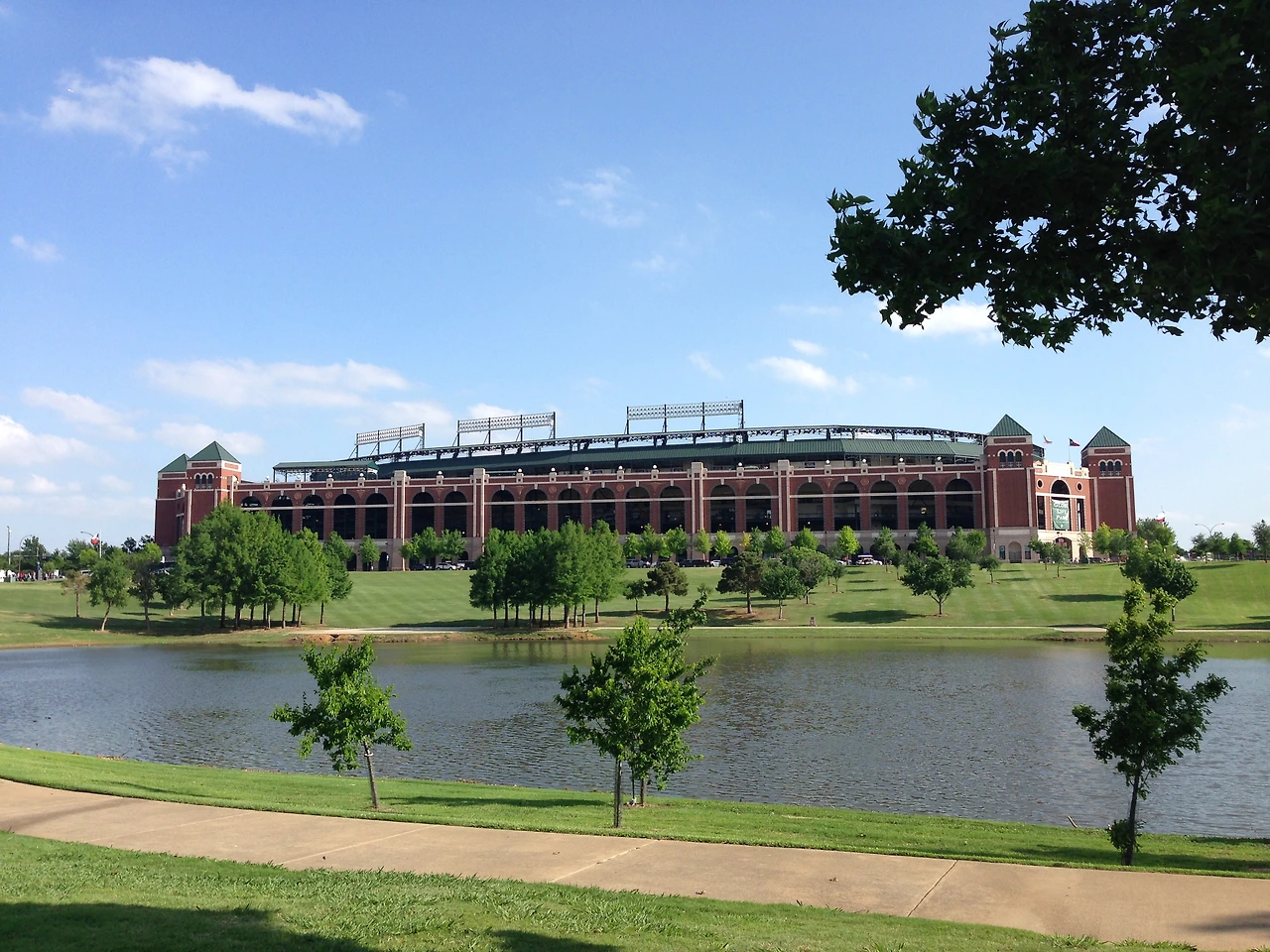 댈러스에서 알링턴까지 비록 거리 상 대단히 멀지 않았지만, 고속도로를 두 세 번이나 갈아타는 길을 운전해오면서 왜 마땅한 대중교통 편이 없는지 이해가 되었다. 네비게이션 안내에 따라 야구장에 거의 다다랐을 때쯤 야구장에 앞서 롤러코스터 레일이 먼저 보였다. 바로 미국의 놀이공원 체인인 식스 플래그(Six Flags)였다. 그리고 조금 더 지나자 교통체증이 시작되더니 머지 않아 야구장을 안내하는 이정표가 나왔다. 알링턴은 댈러스와 포트워스 사이에 위치한 인구 40만명이 채 되지 않는 작은 도시이다. 1951년부터 1977년까지 알링턴 시장을 역임한 톰 밴더그리프가 도시 개발을 위해 여러 산업 및 문화 시설을 유치했는데, 그 중 대표적인 업적이 놀이공원인 식스 플래그를 건립한 것과 당시 워싱턴에 있던 세네터스 야구단을 알링턴으로 옮겨 와 텍사스 레인저스를 창단한 것이라고 한다. 우리나라를 기준으로 하면 스케일이 작은 버전의 용인과 같은 계획 개발도시라고 이해하면 될 듯 싶다.