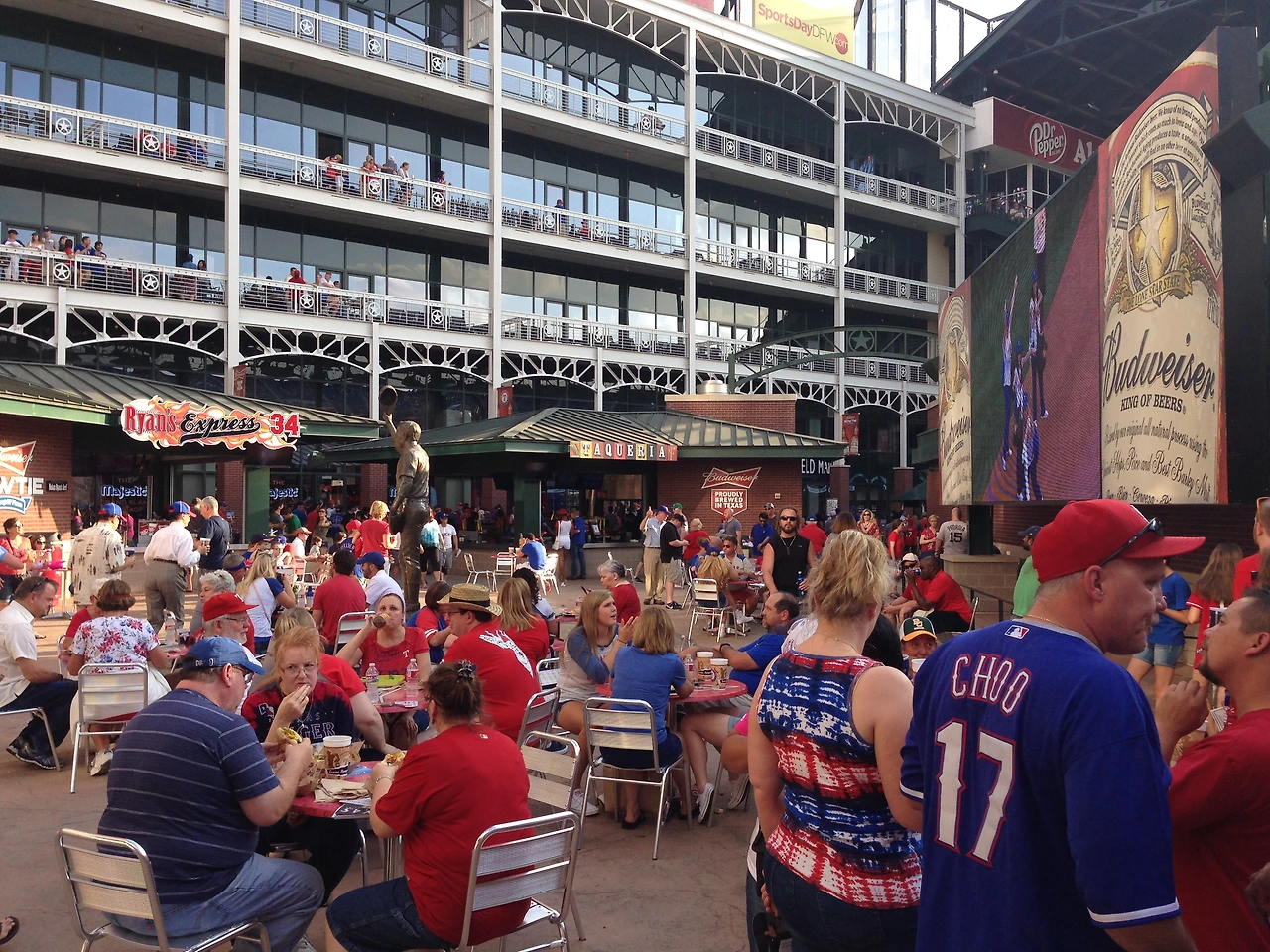 이야기가 나와서 말이니 글로브라이프 파크에도 다른 많은 야구장의 경우와 마찬가지로 음식만 먹는 데 집중할 수 있는 공간이 따로 구비되어 있다. 외야 관중석 뒤쪽으로 가면 ‘밴더그리프 플라자(Vandergriff Plaza)’라는 널찍한 푸드코트 광장이 있다. 여기에서는 붐스틱과 같은 초대형 음식을 팔지는 않지만, 경기 시작 전에 많은 사람들이 몰려서 핫도그, 버거, 나초, 맥주 같은 전형적인 야구장 먹거리를 다양하게 즐기면서 분위기를 달구고 있었다. 광장 한 쪽에 위치한 큼지막한 스크린으로 경기를 생중계해주기 때문에 이닝 도중에도 편하게 경기를 관람하며 음식을 즐길 수 있다. 광장 한가운데에는 텍사스 레인저스 역사에서 가장 위대한 선수라고 할 수 있는 놀란 라이언의 동상이 서 있다. 관중들에게 커튼 콜로 인사하고 있는 모습의 동상을 배경으로 사진을 찍으려는 팬들 때문에 이 광장은 항상 붐볐다. 밴더그리프 플라자와 경기장 사이에는 구단 사무실 건물이 가로지르며 위치해있는데, 대게 외야석 뒤를 탁 트이게 설계해서 지어놓은 보통의 구장들과는 다른 모습이 인상적이었다. 다행히 구단 사무실 건물이라고 해서 쌩뚱맞은 오피스 건물이 있는 것이 아니라 흰색 철제 구조물로 꾸며져 있는 덕에 얼핏 보기에는 단체 스위트 관람석처럼 보였다.