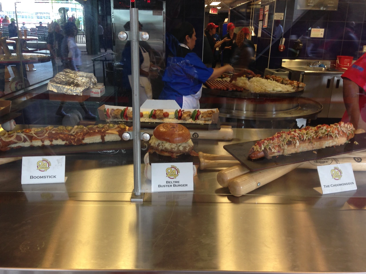 그러나 무엇보다 단연 눈에 들어온 것은 엄청난 크기의 먹거리들이었다. 미국 말에 “Everything’s bigger in Texas (무엇이든 텍사스에 가면 더 크다)”라는 농담이 있다고 하는데 경기장에서 본 먹거리들의 크기는 정말 상상을 초월했다. 그 중 가장 유명한 것으로는 ‘붐스틱(Boomstick)’이라는 이름의 초대형 핫도그가 있다. 지금은 텍사스를 떠났지만 여덟 시즌 동안 레인저스 슬러거로 활약한 넬슨 크루즈가 사용하던 방망이의 이름을 따서 출시된 이 핫도그는 길이 60센티미터에 무게는 1.2~1.3킬로그램 가까이 나간다. 핫도그 빵 위에 소고기 소세지, 칠리 소스, 나초 치즈, 구운 양파, 할라피뇨까지 넘칠 정도로 얹어져 있다 보니 핫도그 한 개가 2,000~3,000 칼로리나 된다. 2012년에 출시된 이 제품은26달러나 되는 가격에도 불구하고 그 해 20,000개 팔렸다고 하니 핫도그 메뉴 하나만 가지고 레인저스 구단의 5억원 이상의 매출을 올린 셈이다. 붐스틱을 맛보고 싶지만 그 어마어마한 크기와 칼로리 때문에 망설여지는 팬들을 위해 ‘미니 붐스틱’ 메뉴도 따로 팔고 있으니 관심 있는 사람들은 먹어봐도 될 것 같다. 그 외에도 레인저스 대표 선수 애드리언 벨트레의 이름을 딴 초대형 햄버거 ‘벨트레 버스터(Beltre Buster)’와 2014년 새로 영입된 추신수 선수의 이름을 따서 출시된 매운 맛 핫도그 ‘추몽구스(Choomongous)’도 레인저스의 초대형 괴식 중 하나이다. 맛이 궁금하긴 했지만 푸드 파이터들이나 도전 가능할 듯한 크기 때문에 포기하고, 대신 여기저기 어린 아이들이 들고 다니던 칠면조 다리를 먹어봤다. 아이들도 먹는 크기라고 생각해서 얕봤지만 남자 손바닥 한 뼘은 족히 되는 크기에 결국 다 못먹었다. 크기에 압도되어 입에 꾸역꾸역 집어 넣다 보니 무슨 맛인지도 모르고 먹었다.