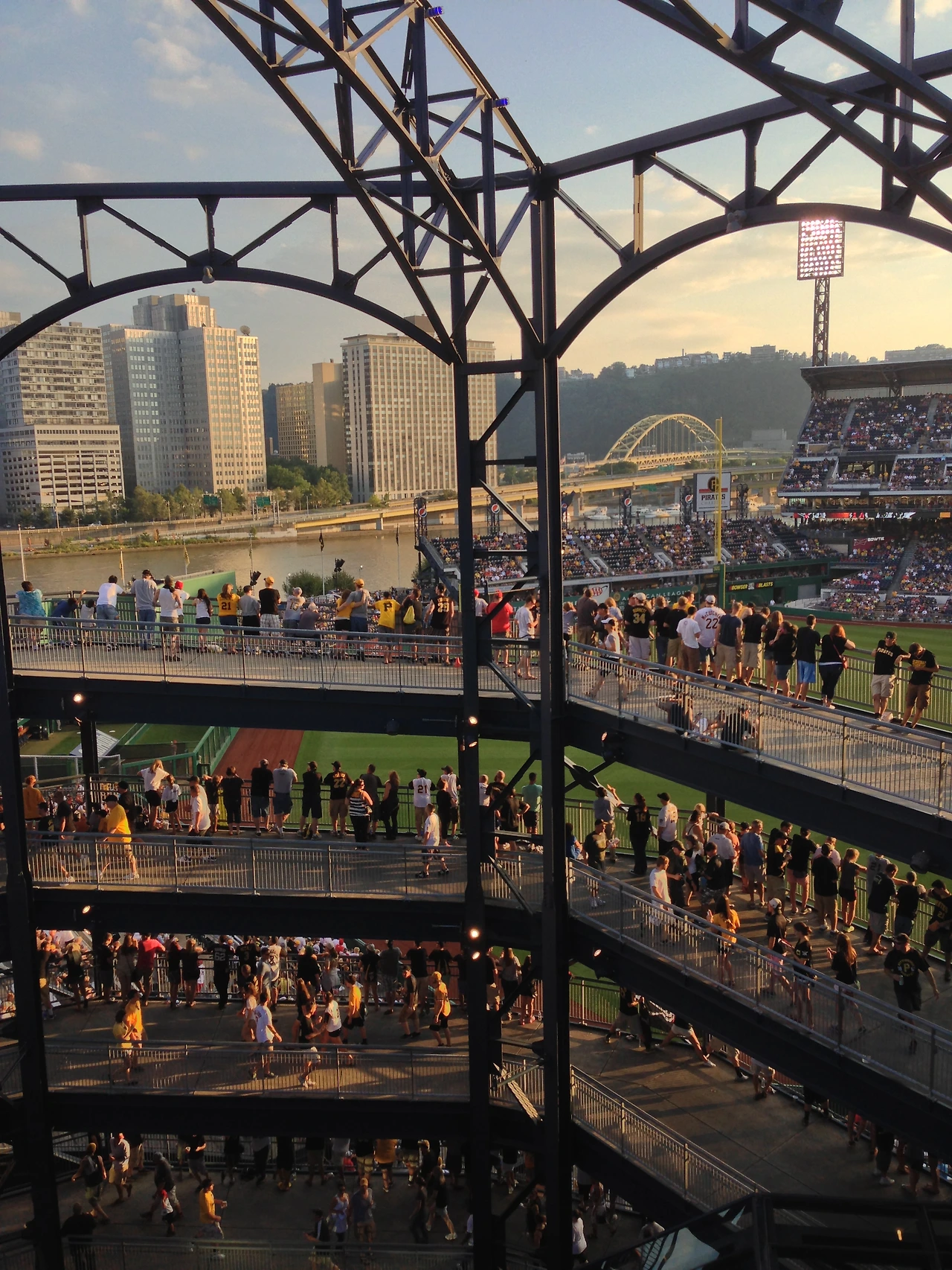 경기장 내부를 한 바퀴 쭉 돌아보니 PNC 파크에서 인상적인 경관들은 외야 쪽에 몰려 있었다. 특히 외야 관중석 뒷편으로 조성된 널찍한 공간에서는 편하게 핫도그를 먹으면서 야구장 바로 옆을 흘러가는 앨레게니 강과 그 뒤로 이어진 도심 속 스카이라인의 풍경을 감상할 수 있다. 며칠 전 비가 온 탓인지 아니면 원래 강물 색깔이 그런 것인지, 강물 색이 흙탕물 색깔에 가까워서 조금 아쉬웠지만 문제될 정도는 아니었다. 가끔 강을 지나가는 배의 뱃고동 소리도 운치있게 들려왔다. 좌측 파울 폴대 뒤로는 4~5층 높이의 나선형 구조물 로턴다(rotunda)가 서 있었다. 원래는 이 곳을 통해 1층에서 내야 꼭대기 층으로 이동할 수 있도록 만들어진 공간이지만 각 층마다 많은 사람들이 발걸음을 멈추고 그라운드 쪽을 향해 지는 석양 빛을 바라보며 여유로운 토요일 저녁을 만끽하고 있었다. 이 곳에서 그라운드가 잘 내려다 보이기도 해서 경기가 시작된 후에도 자기 자리에 앉지 않고 여기에 서서 관전하는 관중들이 많았다.