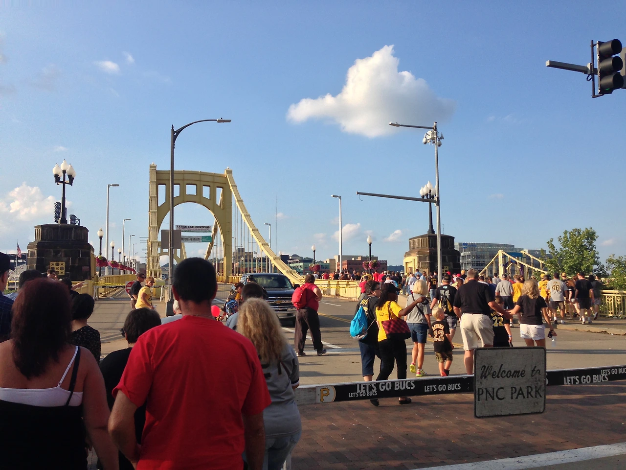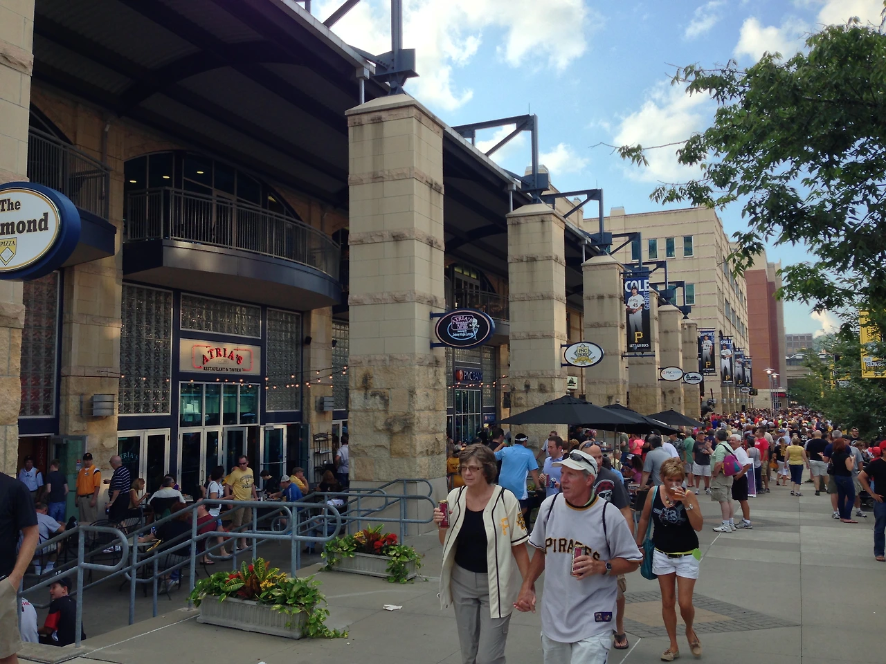이런저런 생각을 하면서 경치를 구경하는 사이 어느새 다리를 건너 PNC 파크에 다다랐다. 경기 시작까지는 아직 한 시간 가까이 남아 있었지만 이미 주변은 벌써 잔치 분위기였다. 경기장 옆을 따라 나 있는 페데럴 스트리트는 차량 통행이 통제되어 있었고 대신 검은색과 노란색의 파이어리츠 티셔츠를 입은 팬들로 붐볐다. 사람들은 저마다 캔맥주나 병맥주 하나씩을 손에 들고 삼삼오오 모여 신나게 떠들고 있었다. 거리에 줄지어 있는 레스토랑과 스포츠 펍도 이미 반쯤 취한 손님들도 북적댔고, 가게들 틈 사이에서 거리 공연을 하는 밴드도 보였다. 불과 10분 전만 해도 고층 빌딩이 즐비한 도심이었지만 다리 하나 건넜더니 자유로움 가득한 다른 세상이었다. PNC 파크가 다운타운에 인접해 있어 테일게이트 파티를 할 수 있는 여건이 아니다 보니 그들 나름의 방식으로 식전 음주행사를 벌이고 있는 모양이었다.