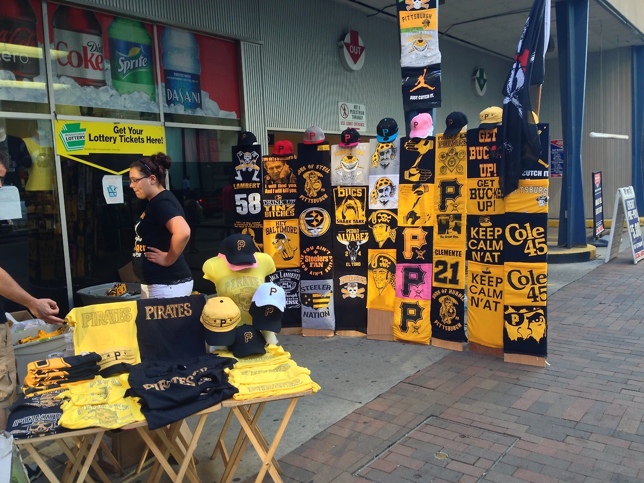 점심시간이 한참 지나고 나서야 간단히 숙소에 짐을 풀고 야구장을 향해 나섰다. 주말 저녁이라 그런지 아니면 당시 파이어리츠가 한창 잘 나갈 때라 그런지, 경기 시작 한참 전임에도 불구하고 다운타운에 피츠버그 저지를 입은 팬들이 많았다. 그들의 행렬을 따라 6번 가로 들어서니 거리 곳곳에 벌써부터 파이어리츠 티셔츠를 판매하는 가판대들이 늘어서 있었다. 해적선장, 해골 문양을 소재로 한 재미있는 티셔츠들이 많이 보였다. 특히 파이어리츠 구단의 상징색이 검은색과 노란색이다 보니 더욱 눈에 확 들어왔다. 이 검은색과 노란색 조합은 피츠버그 시의 깃발 색에서 따온 것이다. 오래 전 파이어리츠 유니폼은 전형적인 흰색 바탕의 빨간색, 파란색의 조합이었으나 1948년에 시의 깃발 색깔에 착안하여 지금의 색 조합로 변경되었다고 한다. 피츠버그를 연고로 한 미식축구 팀 스틸러스나 아이스하키 팀 펭귄스도 비슷한 계열의 색깔을 유니폼 색깔로 채택하고 있다. 메이저리그 팀을 보유한 도시 중에 프로스포츠 팀 전체의 상징색이 통일된 도시는 아마도 피츠버그 밖에 없을 것이다.